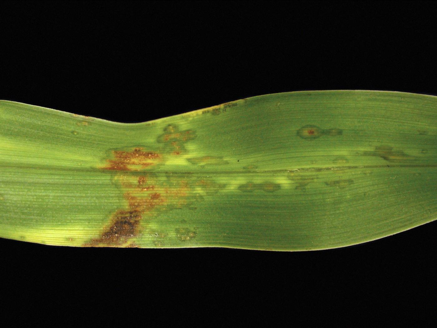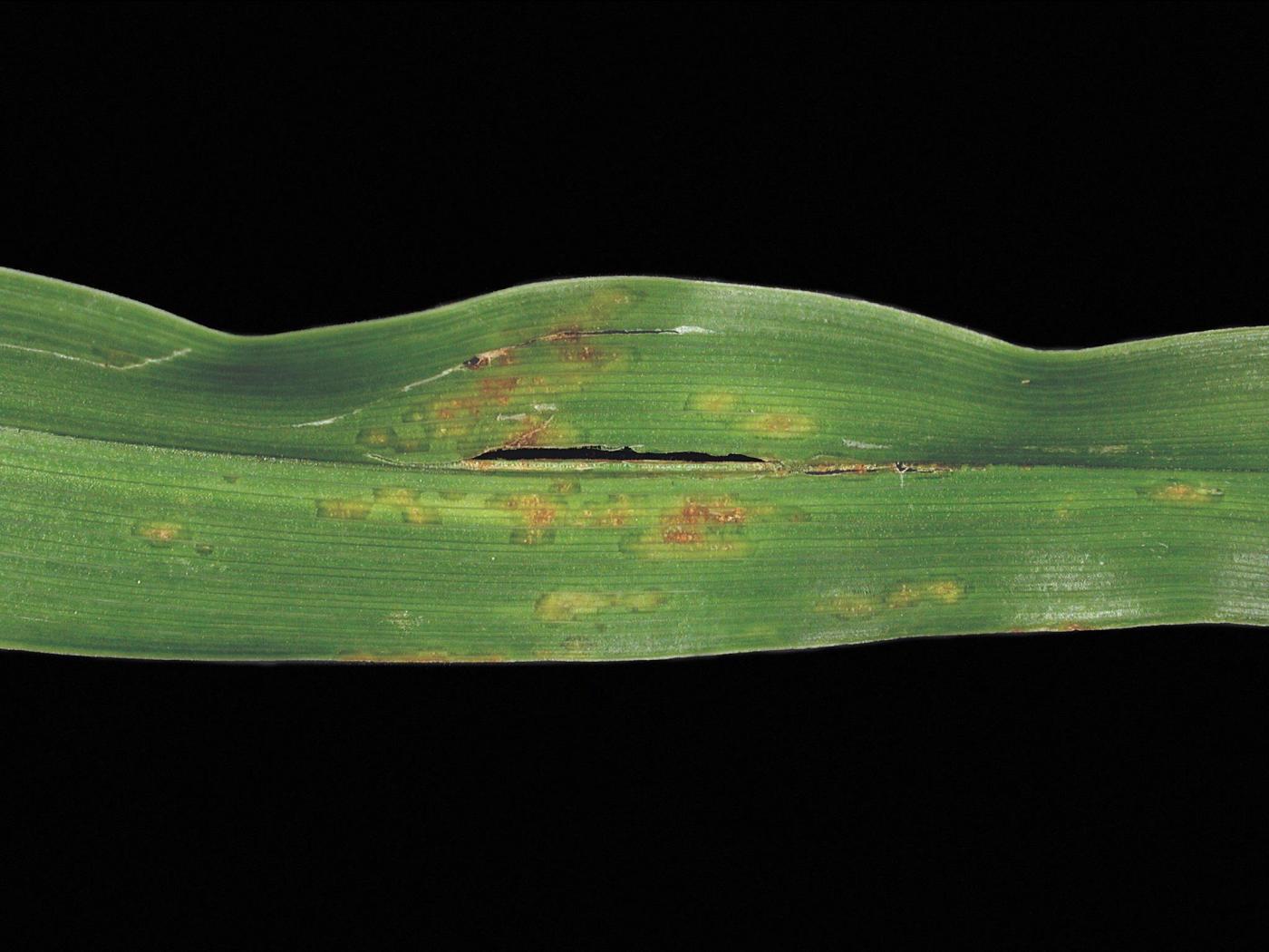Feuille : les symptômes initiaux se manifestent souvent sous la forme d’un jaunissement le long de la nervure centrale. Le jaunissement débute à l'apex des feuilles et progresse vers le bas du limbe et vers la marge à mesure que la maladie évolue. Les tissus infectés deviennent bruns. De petites taches ovales à allongées brun rougeâtre se développent également sur le feuillage infecté. Les taches peuvent se grouper pour former des lésions nécrotiques. Les feuilles basales sont les plus affectées, car elles demeurent humides plus longtemps. Les feuilles très affectées sont parfois déformées (recroquevillées, enroulées en forme de queue-de-cochon) et sèches. Le feuillage infecté dépérit et meurt.