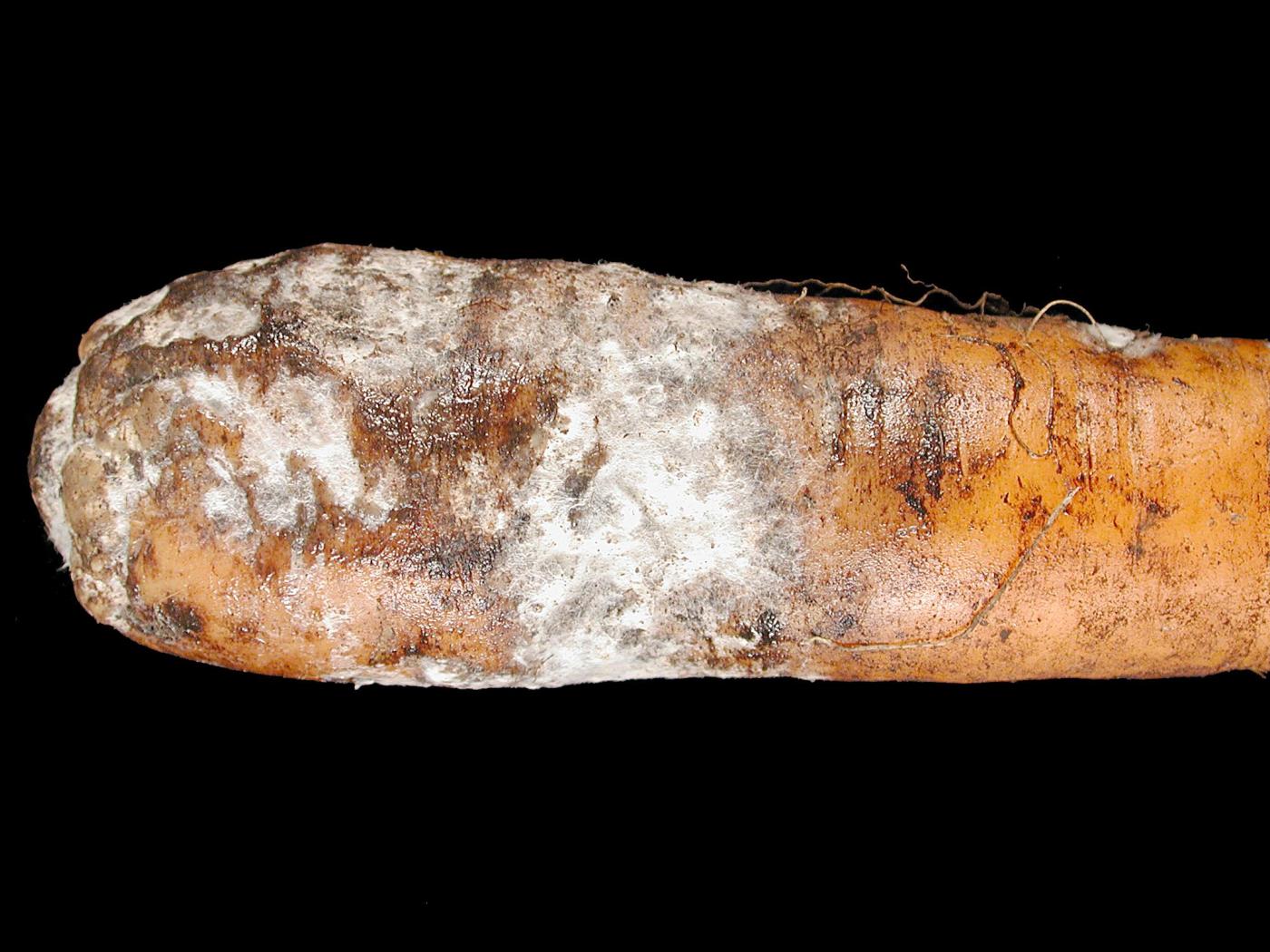 Légende: Pourriture, mycélium blanc et sclérotes immatures sur carotte