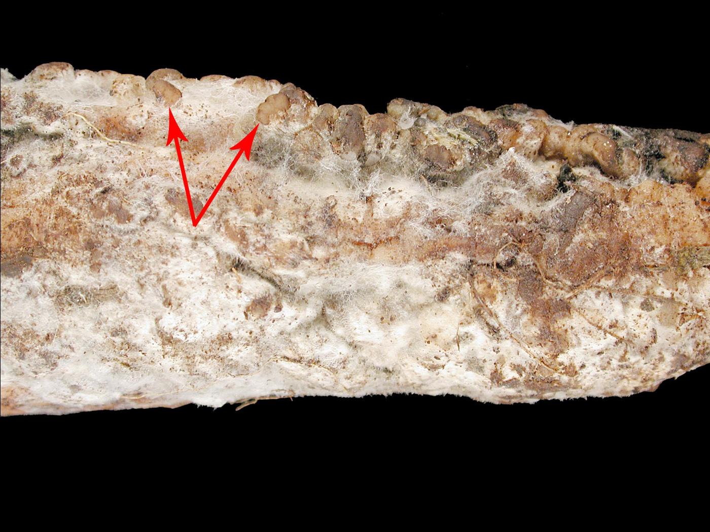 Description: En entrepôt, l’épiderme de la racine est pourri et couvert d’un mycélium blanchâtre. Début de formation de petits sclérotes beiges et un peu fermes (voir flèches). Les tissus internes sont bruns, humides et caoutchouteux. Les tests de laboratoire ont révélé la présence du champignon Botrytis cinerea, responsable de la moisissure grise chez la carotte.
