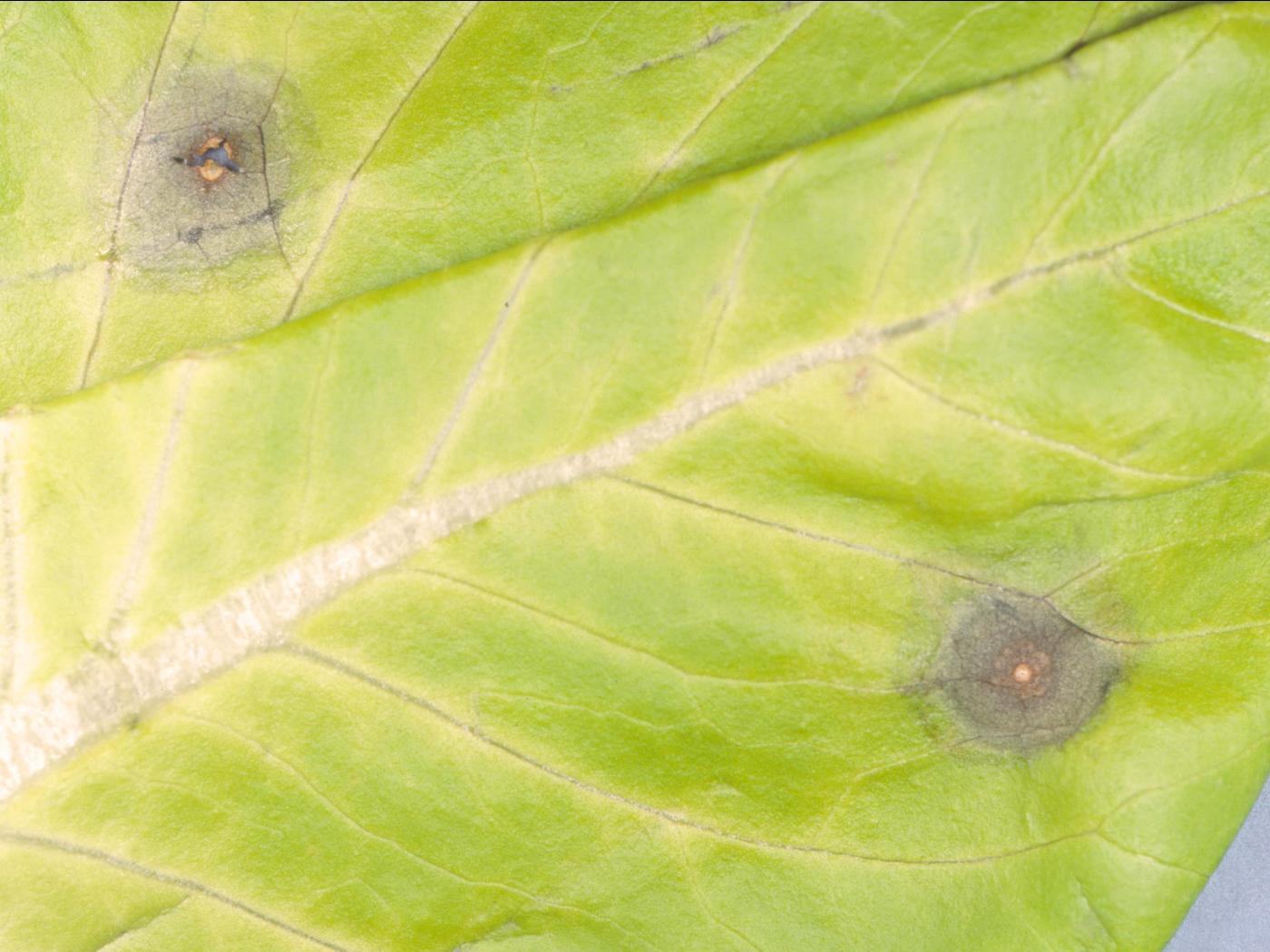 Feuille : présence de petites taches brunes entourées d’un halo vert pâle à jaune. En se développant, les taches deviennent beiges à brunes et irrégulières à angulaires. Un point blanc est fréquemment visible au centre des taches. Les taches ont un diamètre moyen supérieur à 1 cm et le centre des taches demeure pâle (0,5 à 1 mm de diamètre). Les grandes taches sont souvent localisées à la marge. Les taches bien développées sont légèrement déprimées et nécrotiques. Un duvet grisâtre, composé de structures fongiques du champignon, est parfois visible sur les deux faces de la feuille. Les tissus foliaires meurent lorsque la concentration de tache est trop élevée. Les symptômes se manifestent en premier sur les feuilles extérieures puis progressent vers les feuilles du cœur.