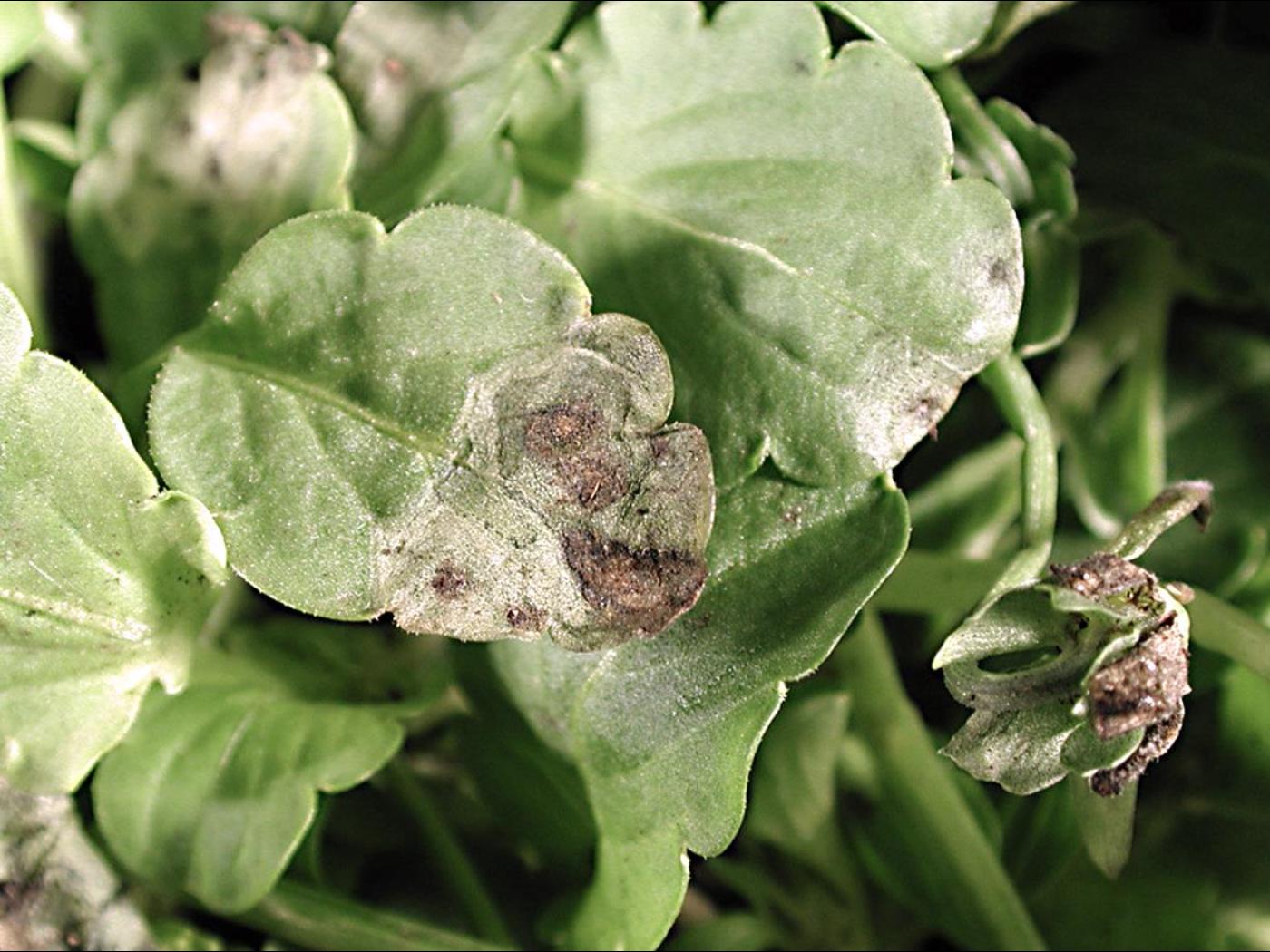 Feuille : les vieilles feuilles sont affectées en premier et la maladie progresse ensuite vers les jeunes feuilles. Les taches sont beiges au centre, bordées d’une marge pourpre à brun, circulaires et mesurent entre 2 et 5 mm de diamètre. En vieillissant, les taches deviennent grises et se regroupent. Les feuillent jaunissent et meurent rapidement. Les feuilles mortes demeurent attachées à la plante. Des fructifications noires du champignon sont parfois visibles à la face inférieure des feuilles ou au centre des taches. Sur les pétioles, les taches sont elliptiques. Chez la pensée, les taches sont pourpres, irrégulières et non délimitées par une marge foncée.