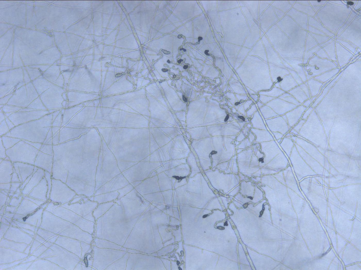 - Appressoria : Toujours présents (il s'agit d'un critère d'identification important). Brun pâle à brun foncé. Les appressoria se produisent suite à la germination des conidies. Visibles en dessous des mises en culture.