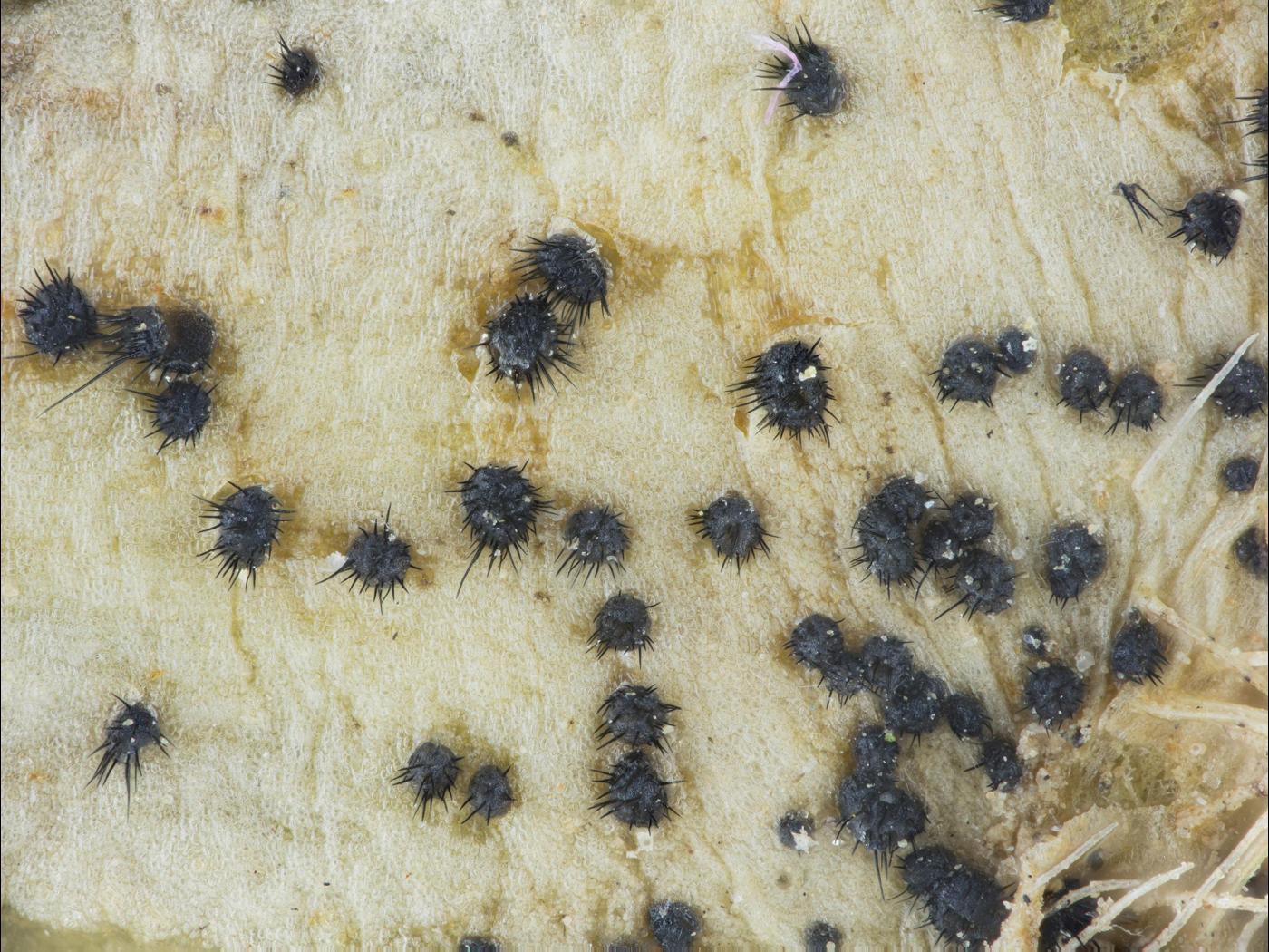 Description: Sur cette macrophotographie, on observe un acervule formé sur le collet d'un plant de soya. Cet organe fongique de reproduction asexuée a une taille d'environ 200 à 300 µm. De nombreux setae allongées et pointues ressemblant à des petits poils sont érigées sur l'acervule, un signe propre à Colletotrichum sp. Dans le cas présent, il s'agit de Colletotrichum truncatum, responsable de l'anthracnose chez le soya.
