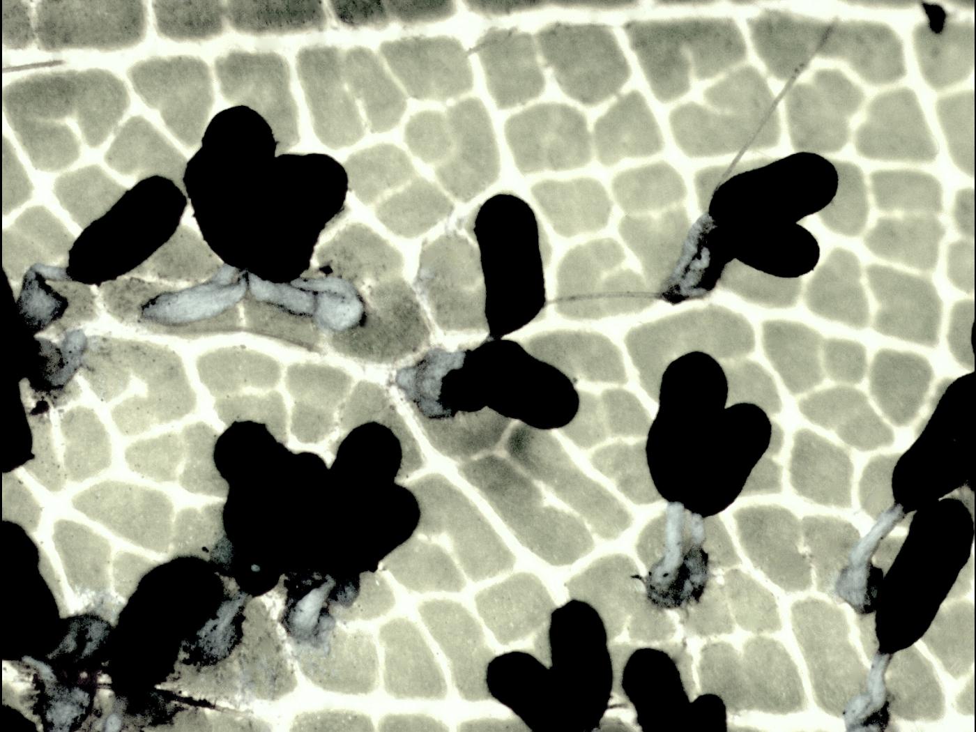 - Plamodium (syn. Plasmode) : Visible à l'œil nu, cette structure est constituée d'un réseau de filaments blancs pouvant être en forme d'éventail; ce plasmodium est de type phanéroplasmodium. La phase immobile du cycle vital.