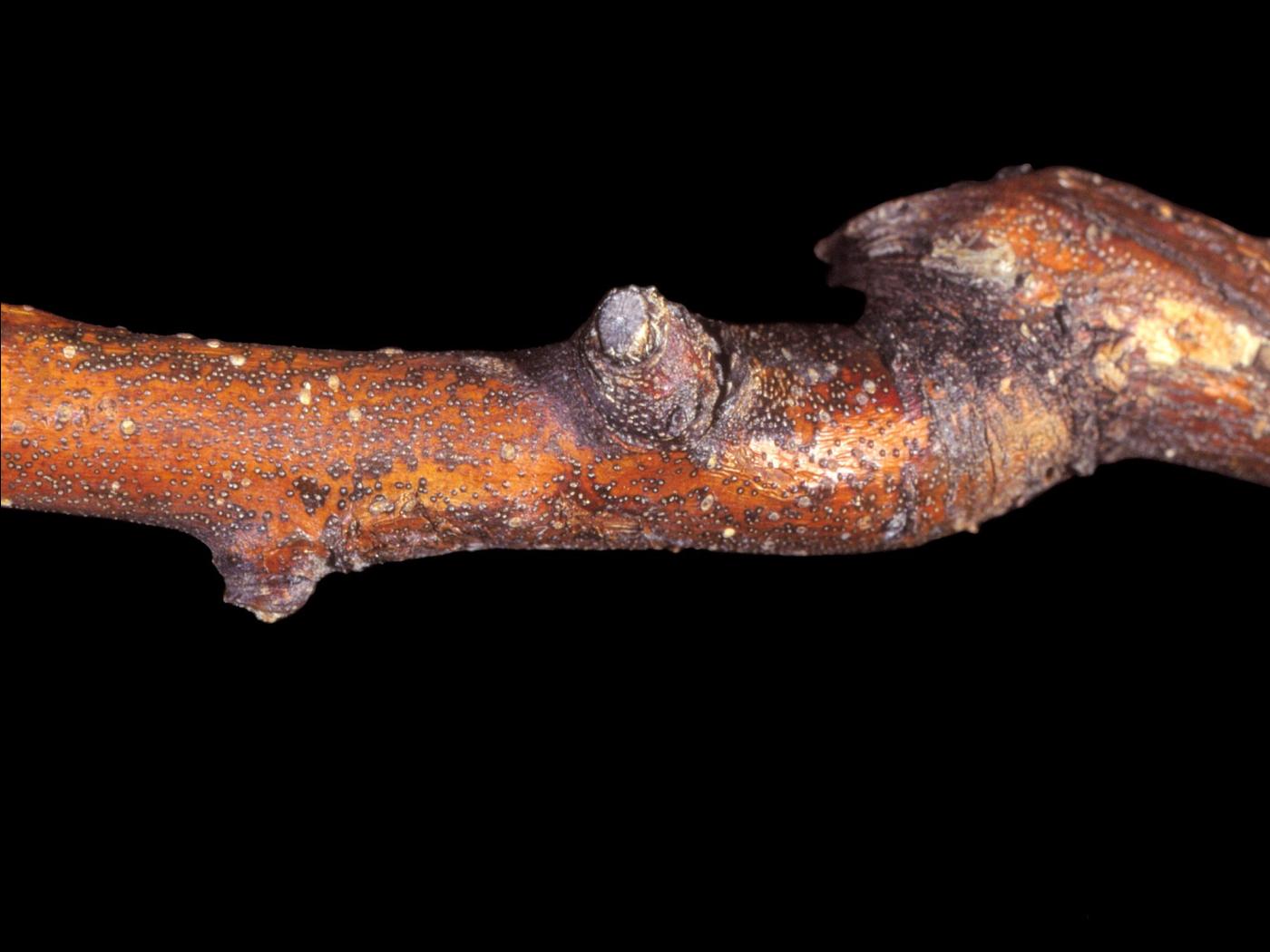 Branche et tronc : au début, les chancres sont rougeâtres, superficiels et forment de petites cloques puis deviennent bruns à noirs et lisses. Sur les arbres vigoureux, le cambium est rarement affecté et les chancres se cicatrisent graduellement et finissent par disparaître. Sur les arbres affaiblis, les chancres prennent de l’expansion, entourent le tronc ou les branches qui finissent par dépérir et mourir. Des tissus calleux se forment à la marge des chancres. Présence de pycnides dans le bois mort ou dépérissant.