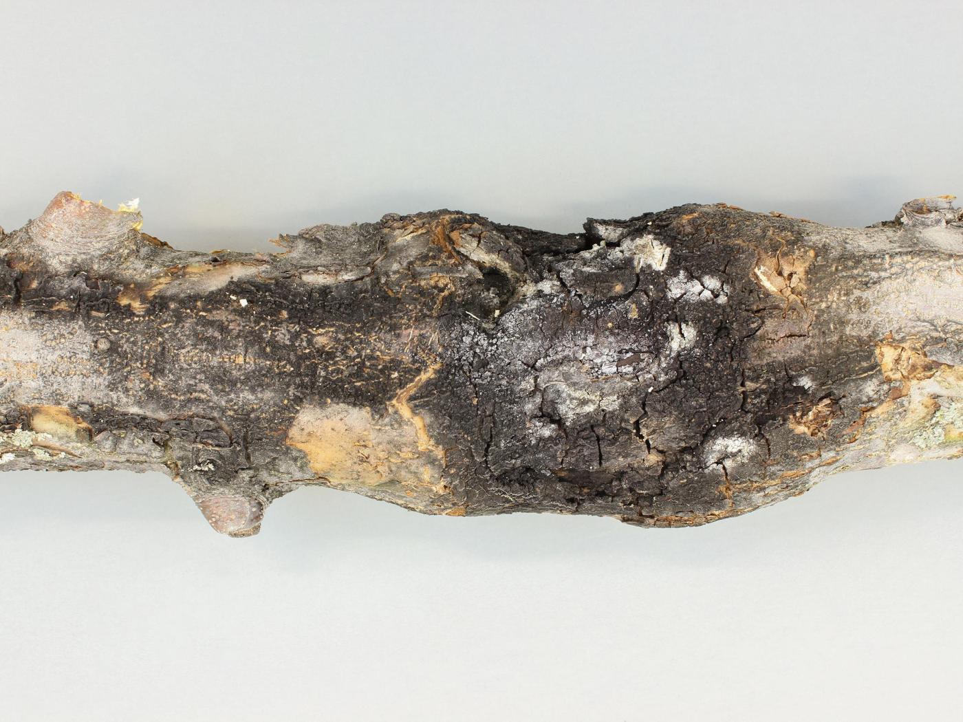 Branche et tronc : sur l’écorce, présence de chancres elliptiques se développant autour des blessures ou des chicots de taille. Les chancres causent une décoloration visible de l’écorce et dans le bois. Des tissus calleux se forment à la marge des chancres. Des pycnides noires peuvent être visibles à la surface des chancres. L’extrémité de la branche au-delà du chancre meurt sans tuer l’arbre. Les jeunes arbres peuvent mourir lorsque le chancre encercle tout le tronc.