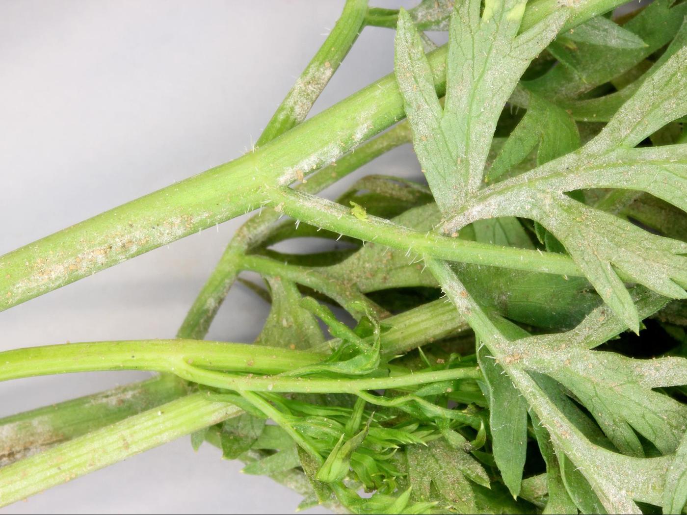 Description: Sur des feuilles de carotte, présence d’un fin duvet blanchâtre à grisâtre à la face inférieure et sur les pétioles (voir flèches). Les feuilles affectées prennent une coloration jaune puis brune et dépérissent. Les observations microscopiques ont révélé la présence de mycélium et de conidies du champignon Erysiphe sp., responsable de la maladie du blanc (oïdium). Il s’agit probablement d’Erysiphe heraclei, rapporté chez la carotte.