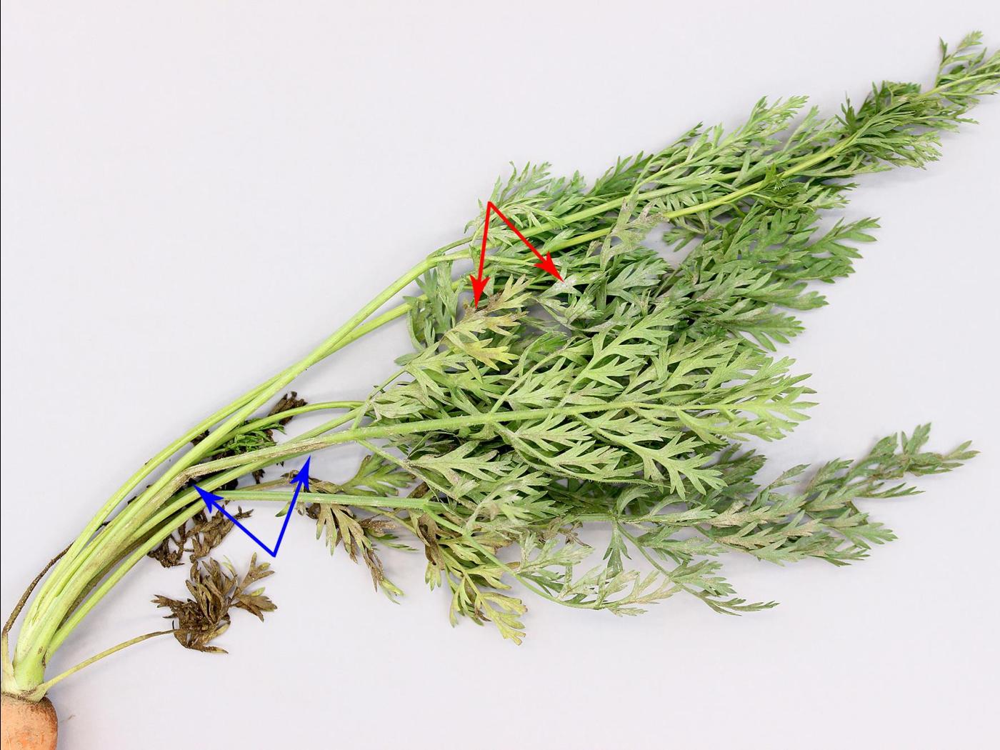 Description: Sur des feuilles de carotte, présence d’un fin duvet blanchâtre à grisâtre à la face inférieure (voir flèches rouges) et sur les pétioles (voir flèches bleuets). Les feuilles affectées prennent une coloration jaune puis brune et dépérissent. Les observations microscopiques ont révélé la présence de mycélium et de conidies du champignon Erysiphe sp., responsable de la maladie du blanc (oïdium). Il s’agit probablement d’Erysiphe heraclei, rapporté chez la carotte.