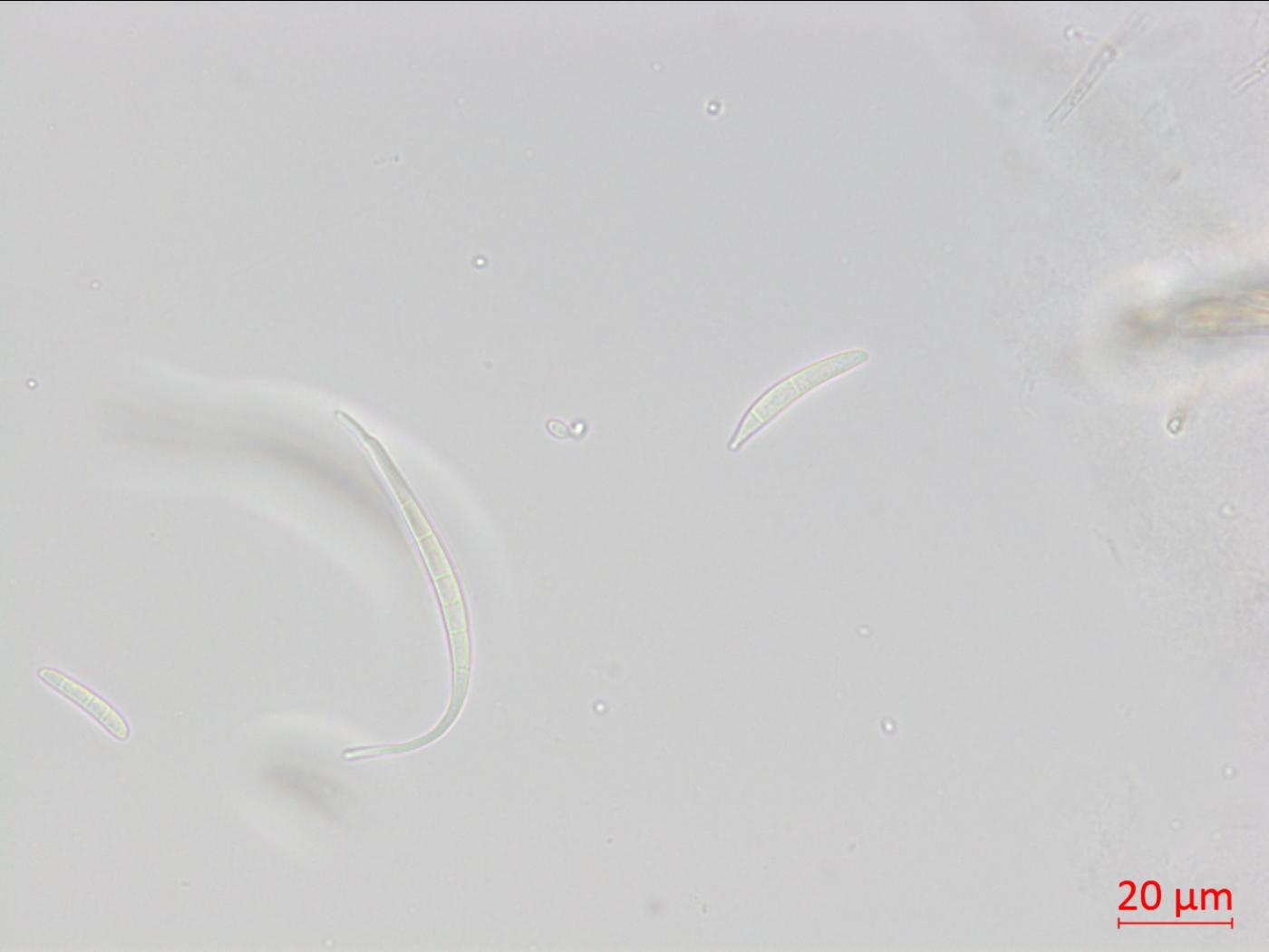 - Macroconidies : Longues et minces phragmospores à 5-7 septations transversales; une septation centrale est souvent présente. En forme de faucille - côté dorsal et côté ventral nettement arqués. Cellule apicale effilée et allongée ou en forme de fouet (caractéristique importante de cette espèce). Cellule basale en forme de pied allongé. Pouvant être regroupées en sporodochies orange. Dimension : 22-45 × 3,5-5 μm (si 3 septations), 40-58 x 3,7-5 μm (si 5 septations), 42-60 x 4-5,9 μm (si 7 septations).