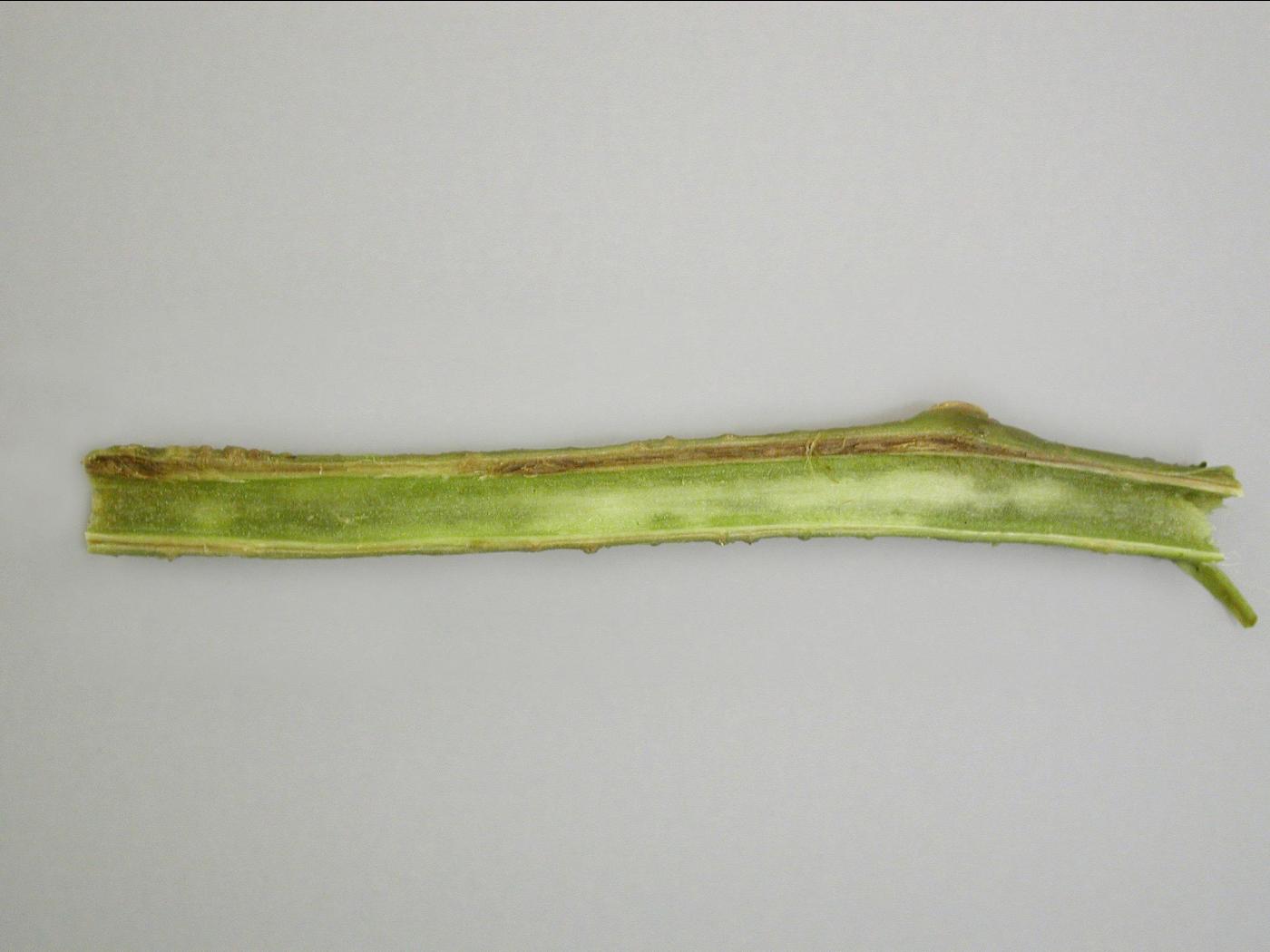 Tige : sur un seul côté de la tige, présence d’une bande longitudinale jaune sur l’épiderme qui se transforme progressivement en un chancre, exposant le cortex qui devient brun et légèrement déprimé. La zone chancreuse peut s'étendre sur plusieurs dizaines de centimètres. Coloration brun rougeâtre à brun foncé du système vasculaire qui n’est visible que si la tige est coupée longitudinalement. La moelle n'est pas affectée. L’anomalie de coloration peut progresser plus haut vers les feuilles. Des racines adventives peuvent se former sur la tige.