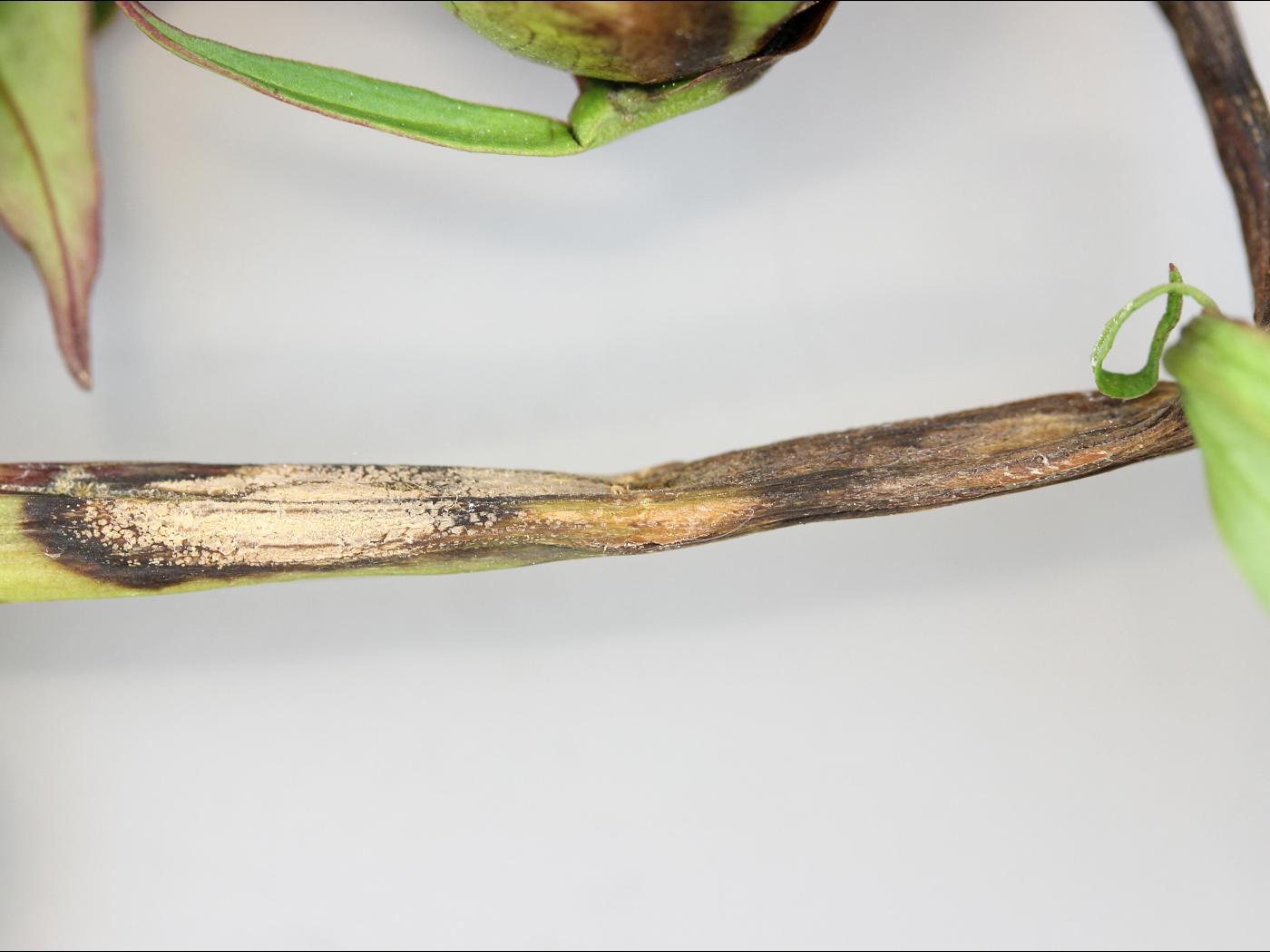 La maladie peut affecter toutes les parties aériennes de la plante, mais les symptômes sont plus fréquemment observés sur les tiges et les fleurs.