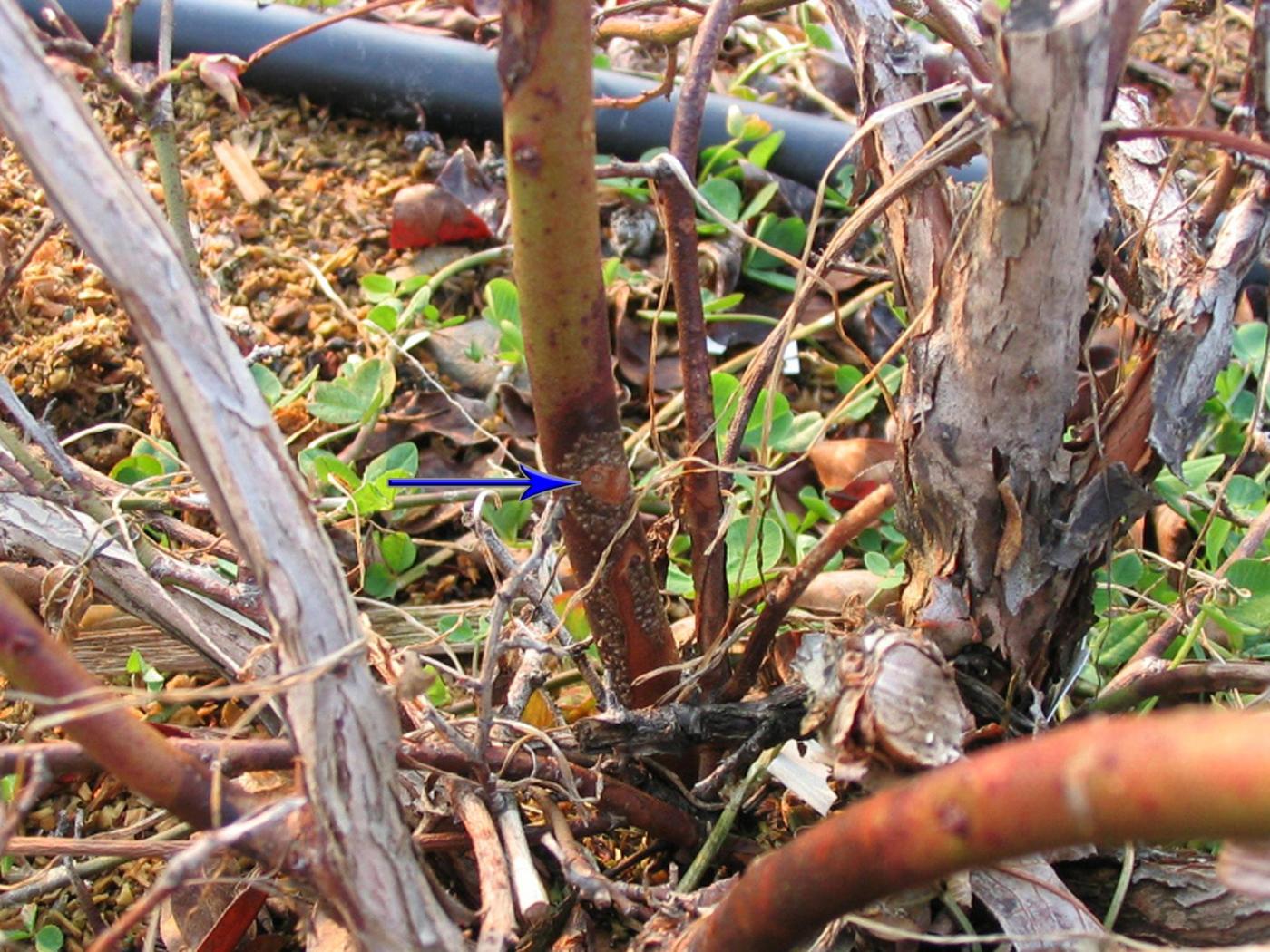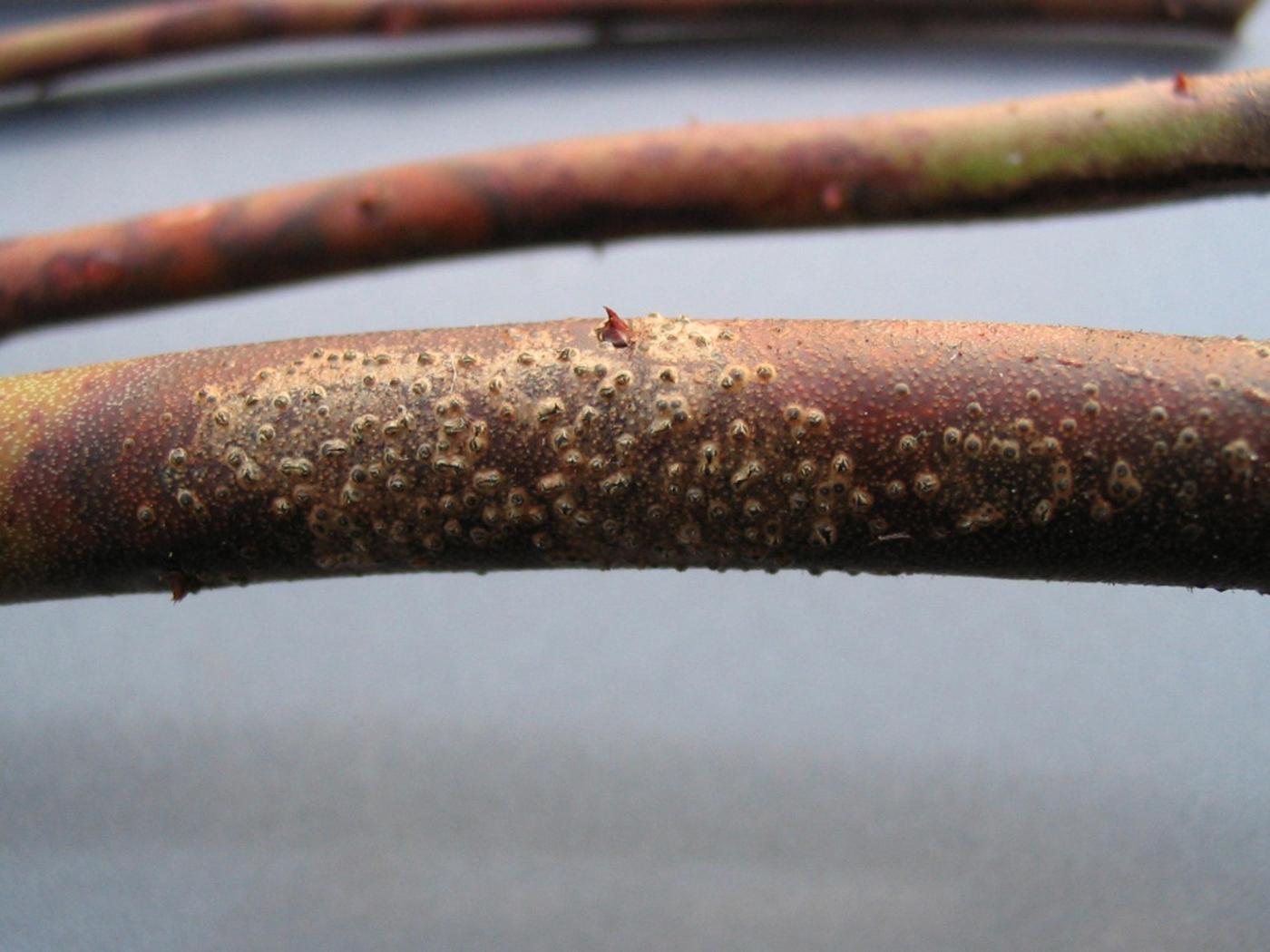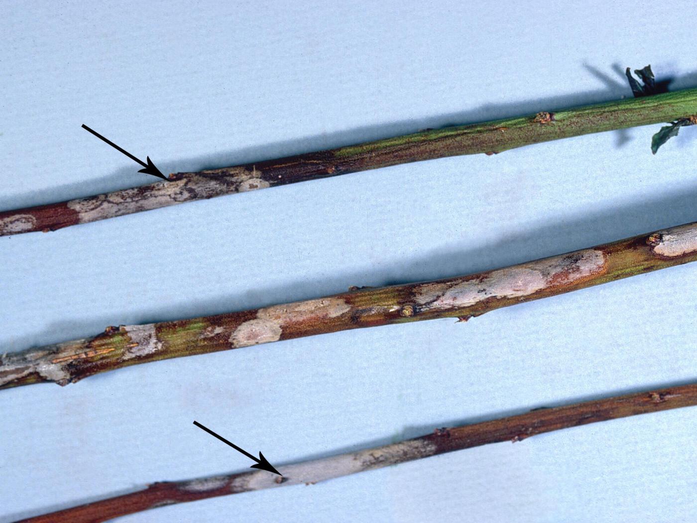 Tige : présence de taches rougeâtres localisées dans la partie basale des jeunes tiges de 1 à 2 années. Les taches entourent généralement les cicatrices foliaires. Ces taches évoluent en des chancres grisâtres entourés d’une large marge rougeâtre. En vieillissant, les chancres deviennent complètement gris et peuvent encercler la tige sur une longueur de 1 à 10 cm. La partie supérieure des tiges sèche et meurt. Généralement une à deux tiges meurent par plant, rarement tout le plant.