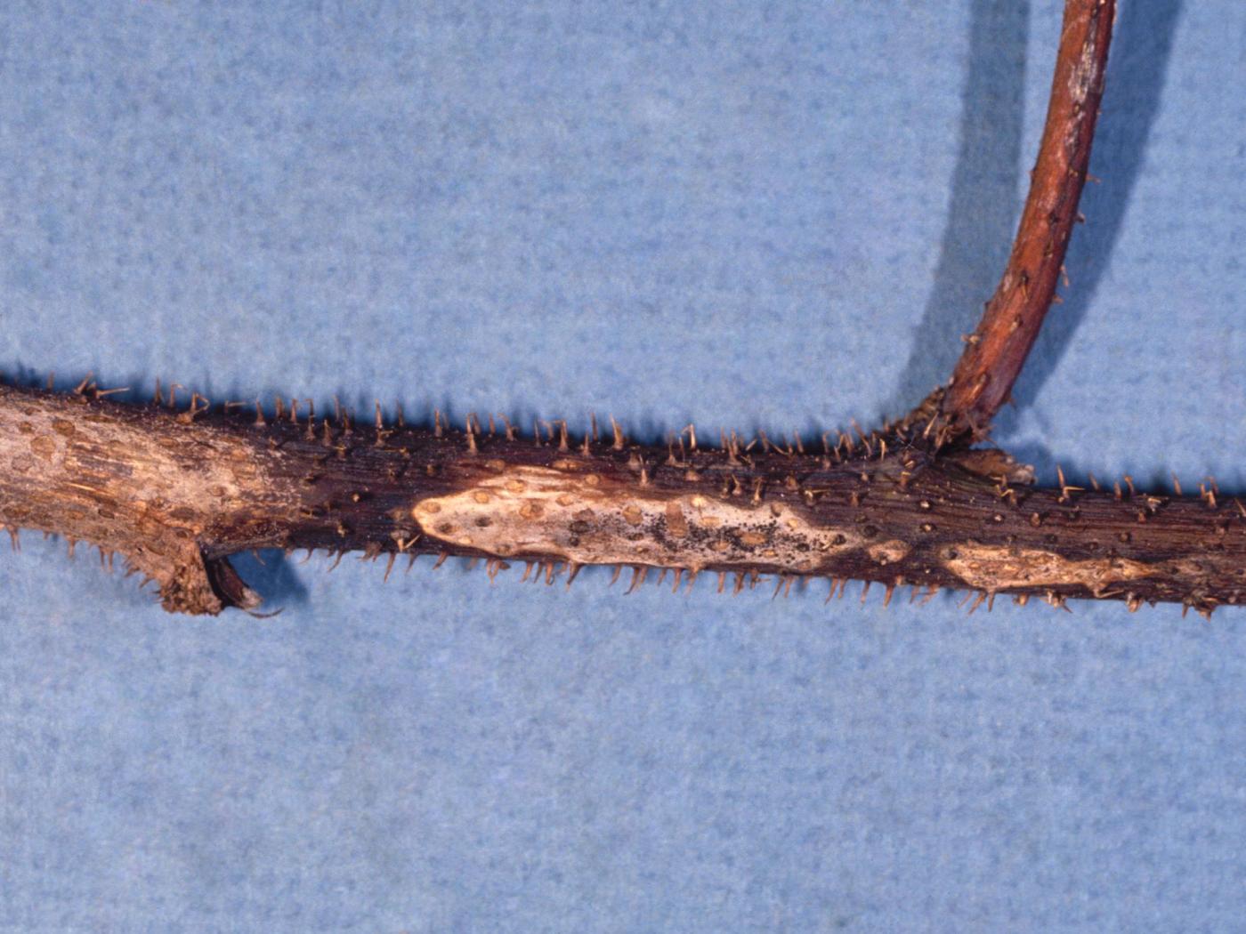 Tige : les symptômes ne sont généralement pas visibles sur les tiges annuelles sauf à l’automne si l’épiderme des primocanes infectées est déchiré, laissant apparaître des stries rougeâtres à brunâtres. Au printemps suivant, des chancres se développent sur les tiges fructifères et le système vasculaire est brun. Les chancres sont brun foncé à pourpres puis deviennent gris argent avec de pycnides au centre des chancres. Les chancres se développent sur une certaine distance vers le haut et le bas, encerclant parfois toute la tige. Dans ce cas, la canne devient cassante, peut flétrir, dépérir et mourir. Flétrissement potentiel des tiges latérales productrices.