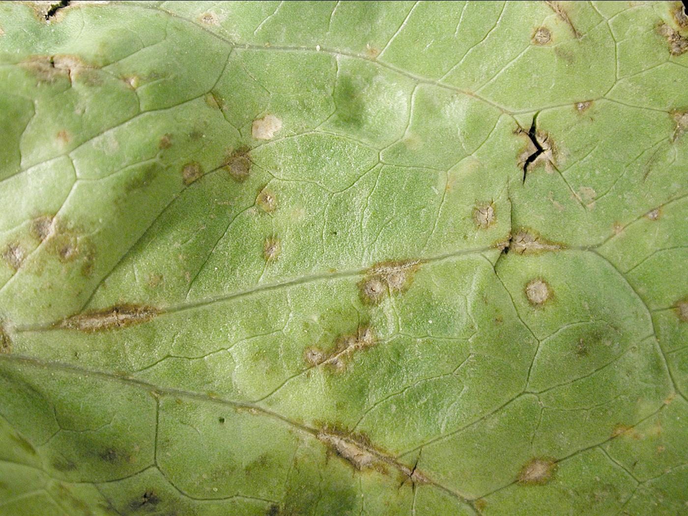 Description: Une feuille de laitue montre de nombreuses taches blanchâtres à brunâtres ayant une marge plus foncée et présentant un halo jaune. Les taches ont une forme ovale et elles mesurent entre 1 et 2 mm de longueur. Le centre des taches a tendance à tomber et à laisser une perforation. Elles sont réparties au hasard sur le limbe ou le long des nervures principales et secondaires et la feuille compte de très nombreuses taches. Sur les nervures principales, les taches sont allongées et ont une coloration… En savoir plus