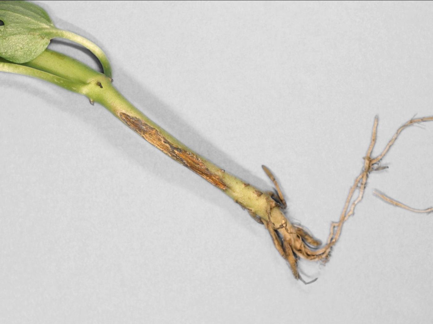 Tige : présence de chancres bruns à noirs dans la partie basale de la tige. Présence de fructifications fongiques (sporodochies crème à orange pâle ou de périthèces avec des ascospores).