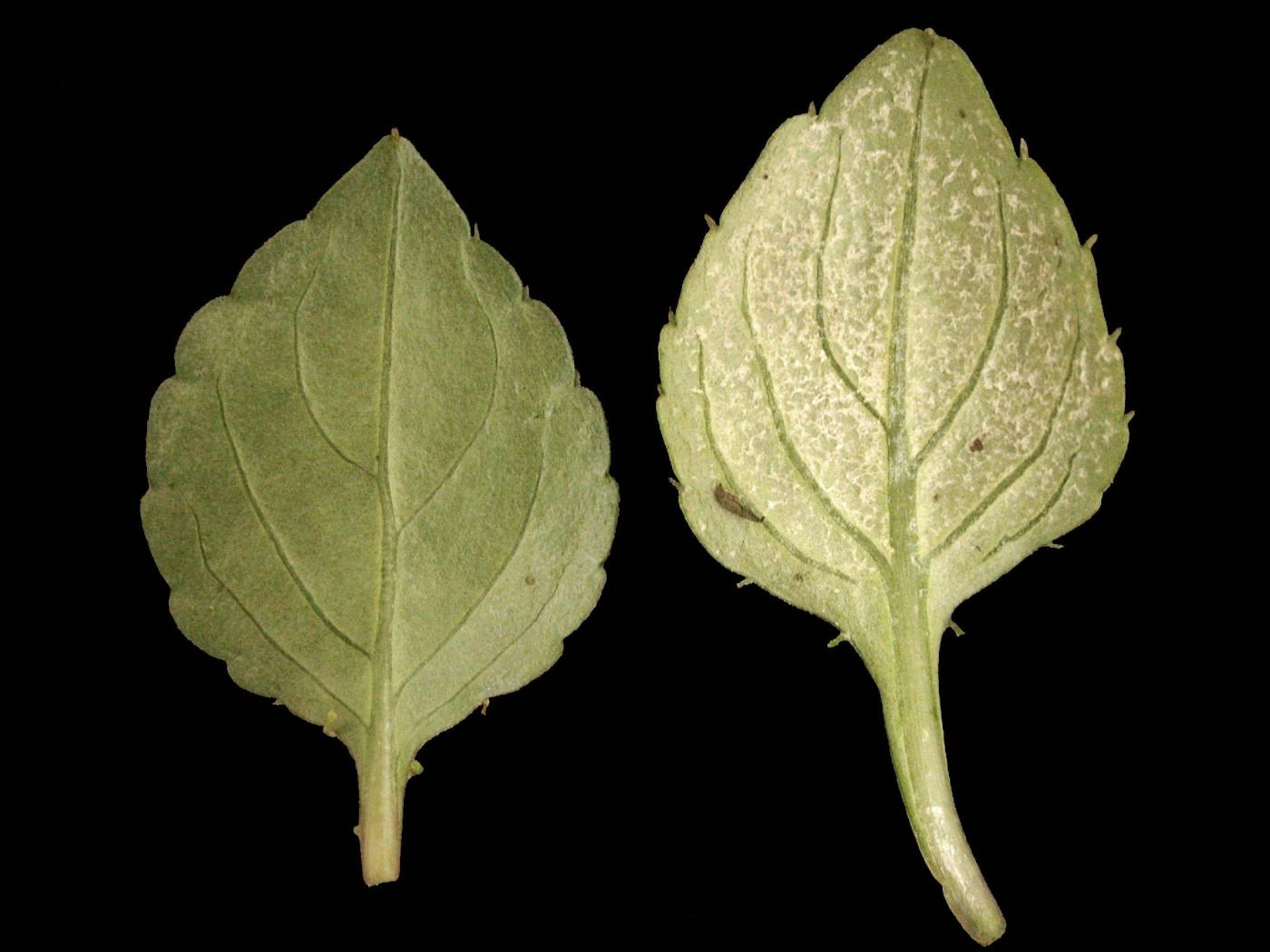 Description: Sur des feuilles d’impatiente commune (cv 'Tioga Neon Salmon') provenant d’une serre, la feuille de gauche est sans symptôme tandis que la feuille de droite est affectée. Elle est couverte d’un duvet blanchâtre à grisâtre à la face inférieure. Les observations microscopiques ont révélé la présence de l'agent pathogène Plasmopara obducens, responsable du mildiou chez l’impatiente commune.
