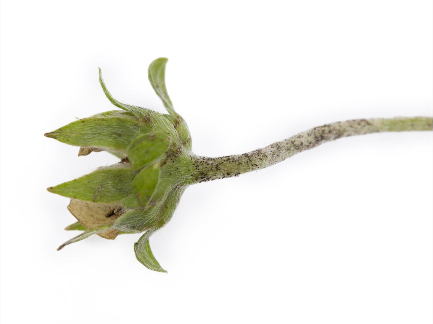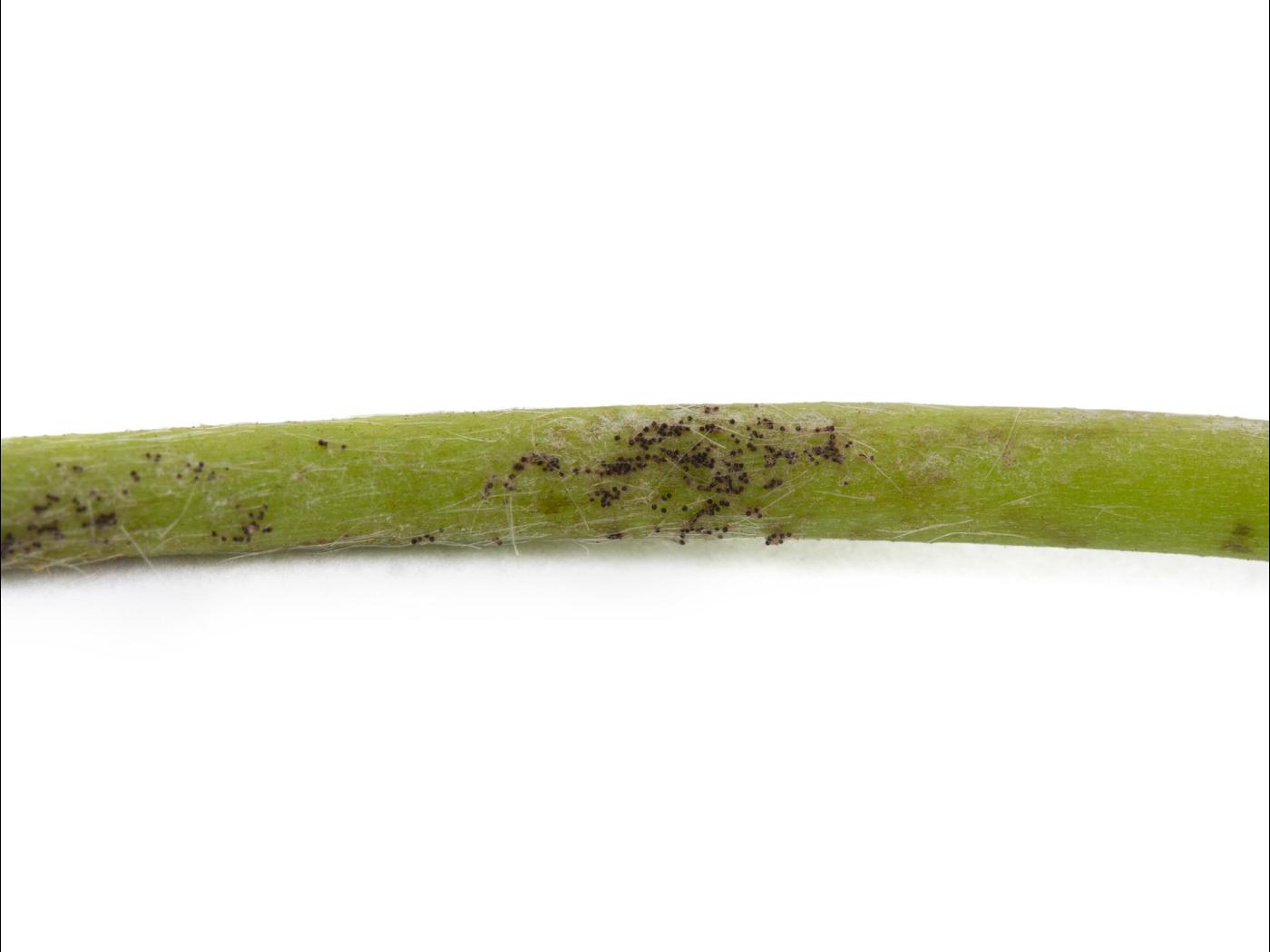 Description: Un duvet blanc (mycélium) et des structures fongiques noires (cléistothèces) recouvrent le pédoncule d’un fraisier. Les tests de séquençage ont permis d’identifier la présence du champignon Podosphaera aphanis, responsable du blanc (oïdium) chez la fraise.