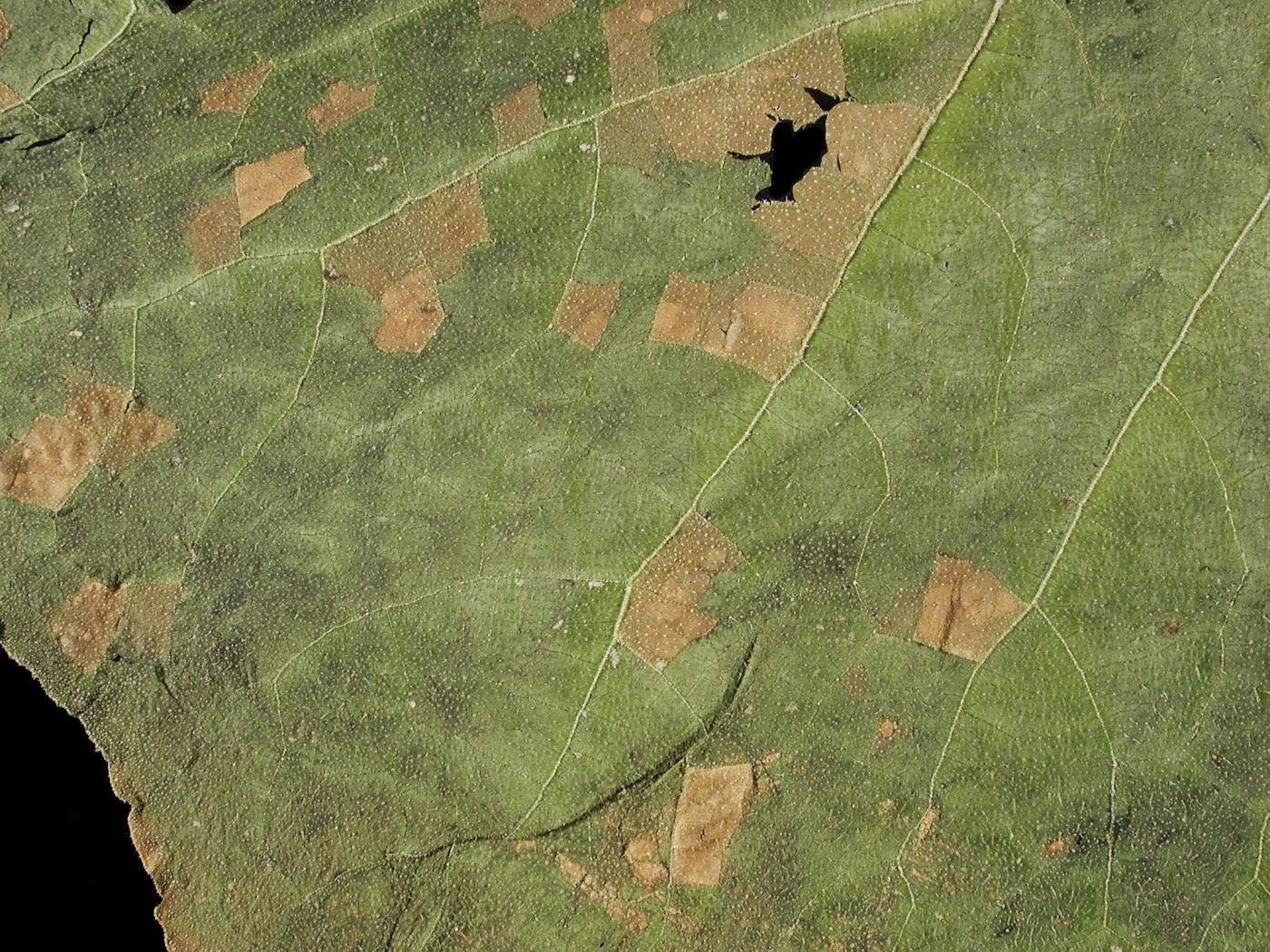 Feuille : à la face supérieure, les taches sont initialement jaunes et angulaires, puis deviennent brunes et peuvent former de larges plages brunes qui finissent par faire mourir les feuilles. À la face inférieure, les taches sont brunes et se couvrent de sporanges de P. cubensis, conférant une teinte brun-violacé au limbe. Les infections débutent toujours sur les vieilles feuilles et progressent vers les jeunes feuilles.