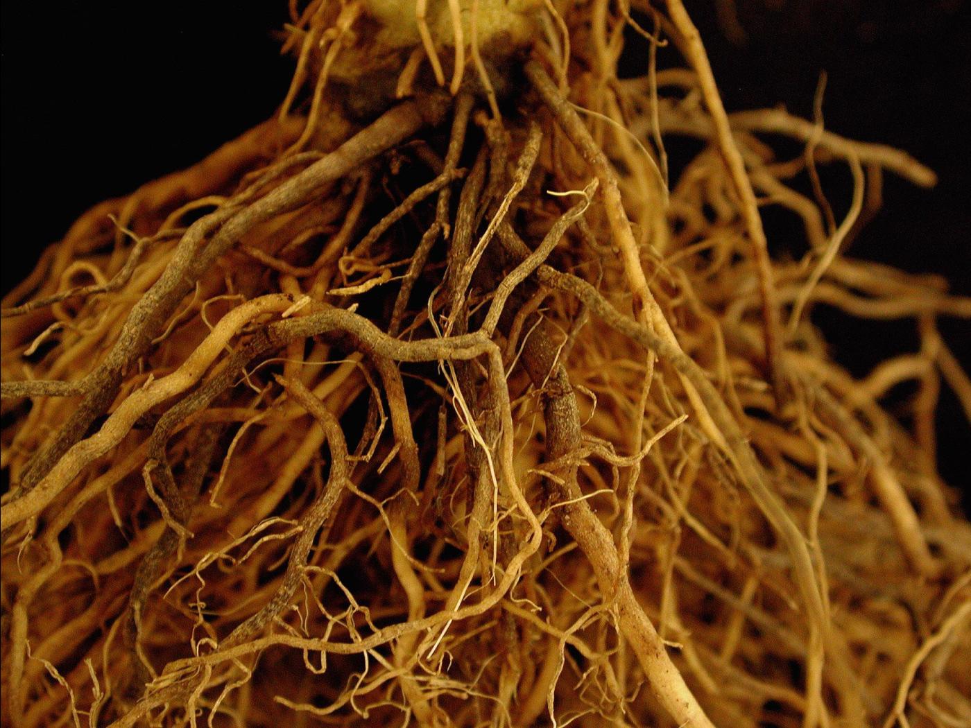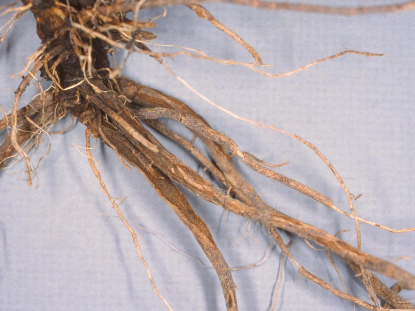 Description: Une vue rapprochée du système racinaire d’un plant de tomate de serre montre des racines renflées, brunes et liégeuses, dont l’épiderme se détache facilement. Les observations microscopiques ont révélé la présence du champignon Pyrenochaeta lycopersici, responsable de la racine liégeuse chez la tomate.