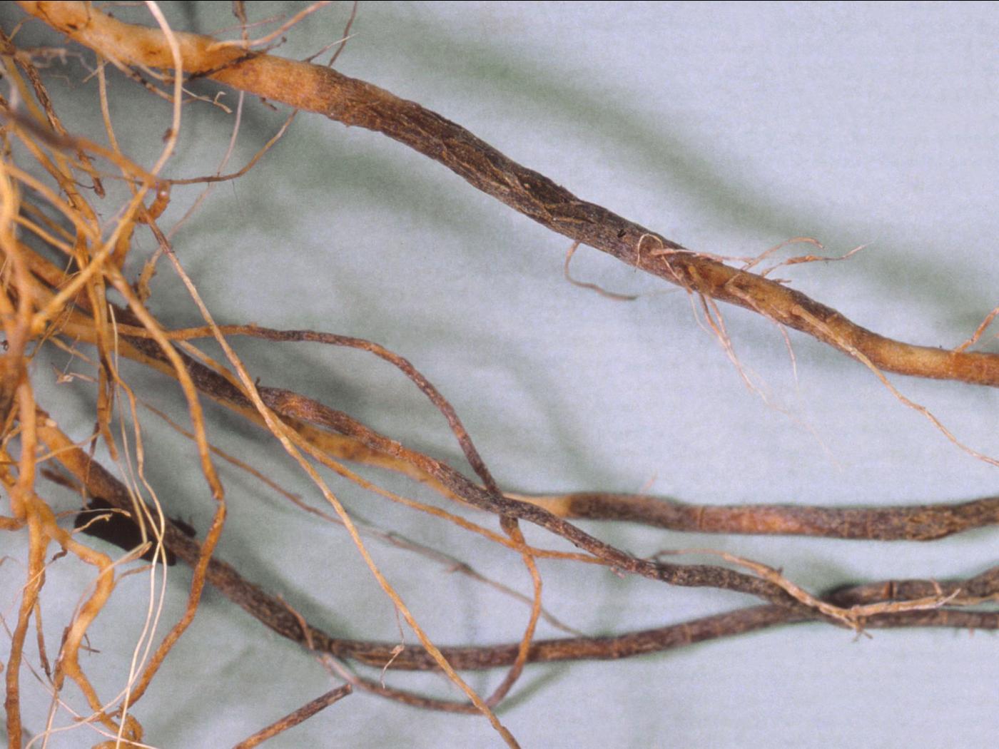 Racine : les radicelles sont infectées en premier et les symptômes se manifestent sous la forme de lésions brun clair d’environ 5 mm de longueur puis d’une pourriture. Les dommages sont appelés « pourriture brune ». Sur les grosses racines, les lésions sont nombreuses, brunes, renflées dont certaines évoluent en un manchon liégeux sec. Des craquelures sont parfois observées sur l’épiderme. Le cortex se sépare facilement de la stèle et prend la forme de « queue-de-rat ». Lorsque le mycélium remplit les cellules racinaires de l’hôte, des microsclérotes rectangulaires caractéristiques de la maladie sont formés. Le volume racinaire est réduit.