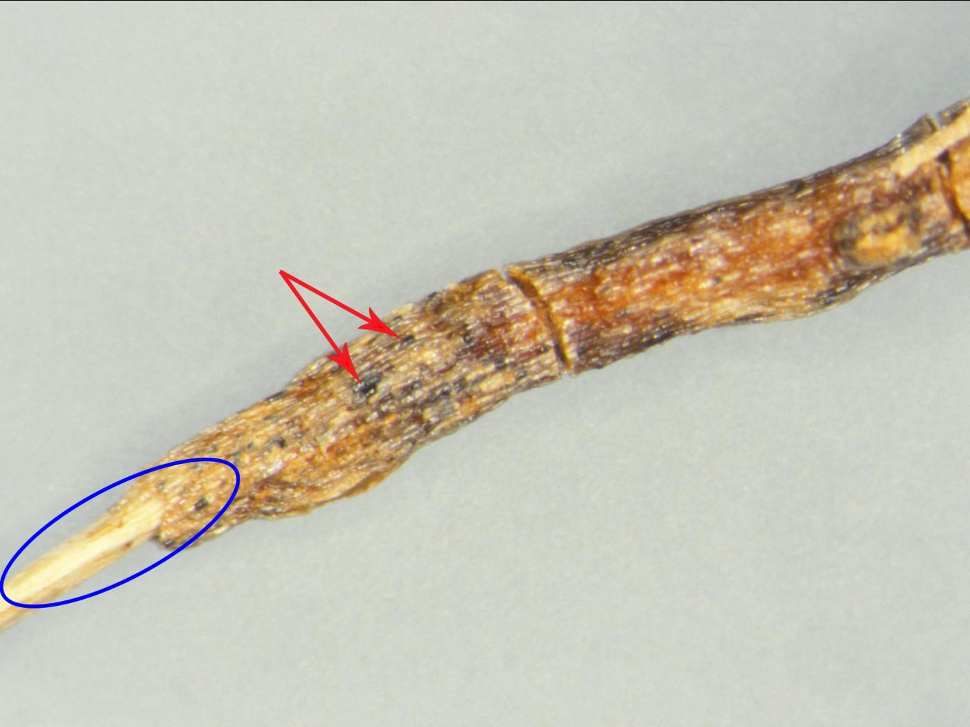 Description: Une vue rapprochée d’une racine d’un plant de tomate de serre montre des microsclérotes rectangulaires noirs (voir flèches) du champignon directement sur l’épiderme. La racine est renflée, brune et liégeuse et l’épiderme se détache facilement (voir cercle). Les observations microscopiques ont révélé la présence du champignon Pyrenochaeta lycopersici, responsable de la racine liégeuse chez la tomate.