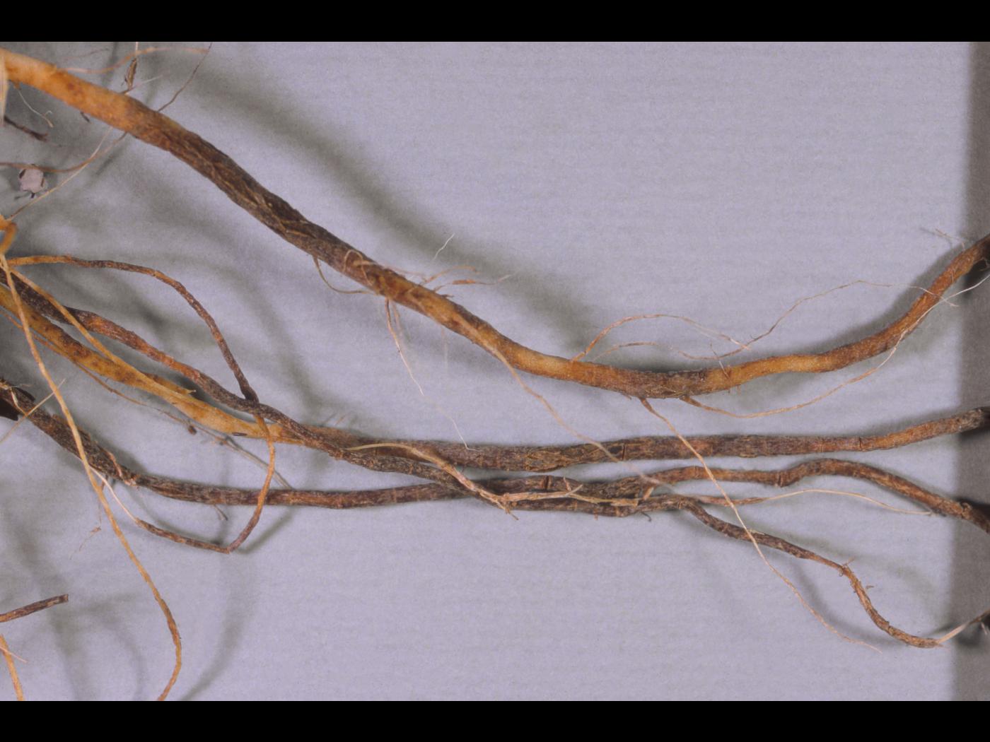 Description: Le système racinaire d’un plant de tomate de serre (cv 'Caruso') montre des racines renflées, brunes et liégeuses. Les observations microscopiques ont révélé la présence du champignon Pyrenochaeta lycopersici, responsable de la racine liégeuse chez la tomate.