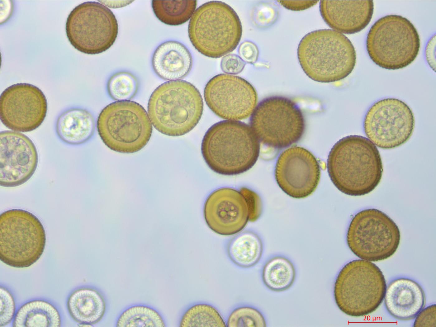 - Téliospores : Globuleuses à légèrement irrégulières. Jaune pâle à brun orangé. Finement échinulées. Diamètre : 18-25 µm.