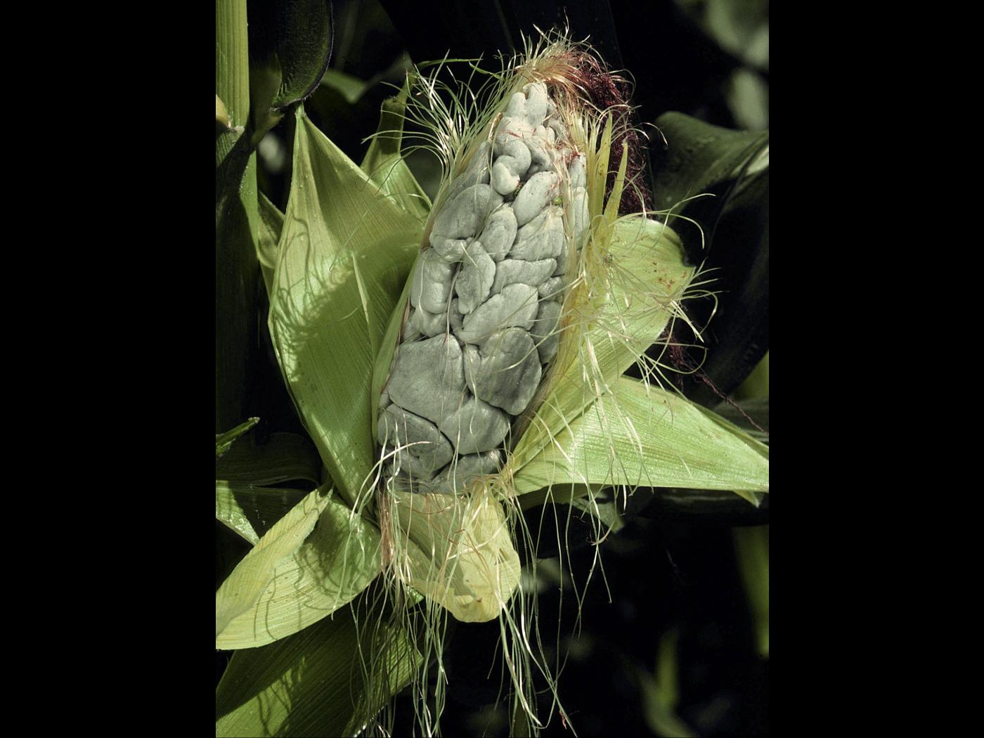 Description: Sur cet épi de maïs grain et fourrager, les grains sont remplacés par des tumeurs couvertes d’une membrane grisâtre. Les tests de laboratoire ont révélé la présence du champignon Ustilago maydis, responsable du charbon commun chez le maïs.