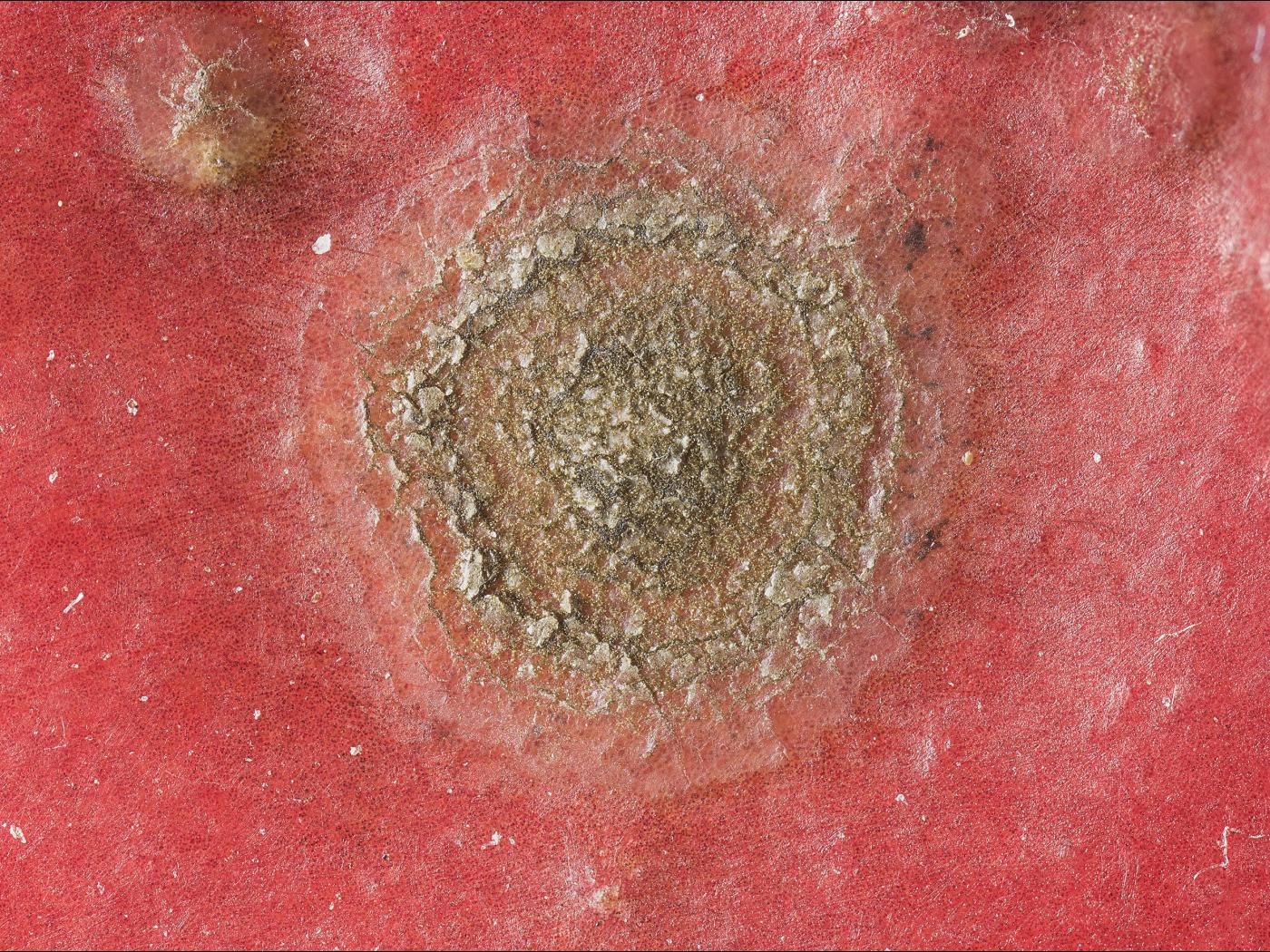 Fruit : les taches observées sur les fruits sont similaires à celles observées sur les feuilles sauf qu’en vieillissant, elles ont un centre brun à noir d’aspect liégeux. Les symptômes apparaissent en premier dans la zone stylaire (œil) puis un peu partout à la surface du fruit. Les dommages sont superficiels. Lors de graves infections, les fruits sont difformes avec des fissures sur l’épiderme et dans la chair. Les taches de la tavelure d’automne sont petites (< 1 mm de diamètre), foncées et légèrement déprimées.