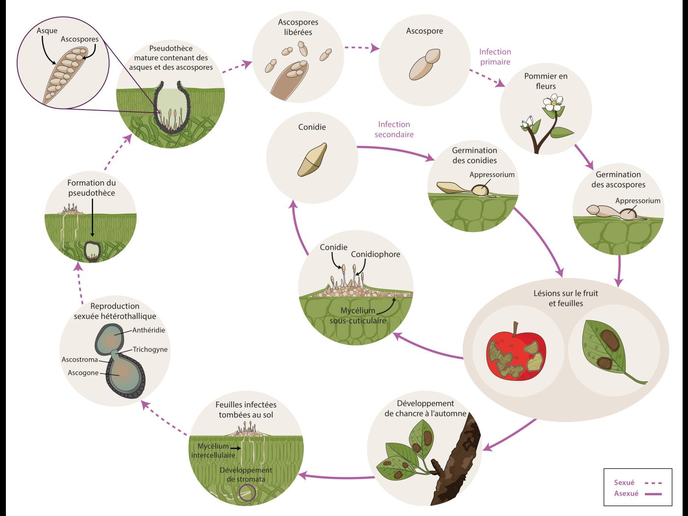 Le champignon hiverne sur les feuilles et les fruits infectés tombés sur le sol dans les vergers. À la fin de l’hiver et au début du printemps, de petits pseudothèces se forment à l’intérieur de ces organes infectés. Leur développement est favorisé par une alternance de périodes sèche et humide et lorsque la température varie entre 8 et 12 °C. Au printemps, quand les feuilles infectées sur le sol sont humides, les ascospores formées à l’intérieur des pseudothèces servent d’inoculum pour les infections primaires. La maturation des ascospores requiert une température variant entre 16 et 18 °C et cela coïncide avec le débourrement des pommiers. Les ascospores sont éjectées des pseudothèces par la pluie et dispersées par le vent sur les tissus verts (feuilles et nouvelles pousses). La maturation et l’éjection des ascospores prennent entre cinq et neuf semaines. La production maximale d’ascospores coïncide avec le stade bouton rose avancé et la pleine floraison. L’éjection et la germination des spores ainsi que l’infection nécessitent des tissus humides ou mouillés par la pluie ou la rosée. Sur les feuilles, les symptômes apparaissent entre 9 et 17 jours après l’infection.