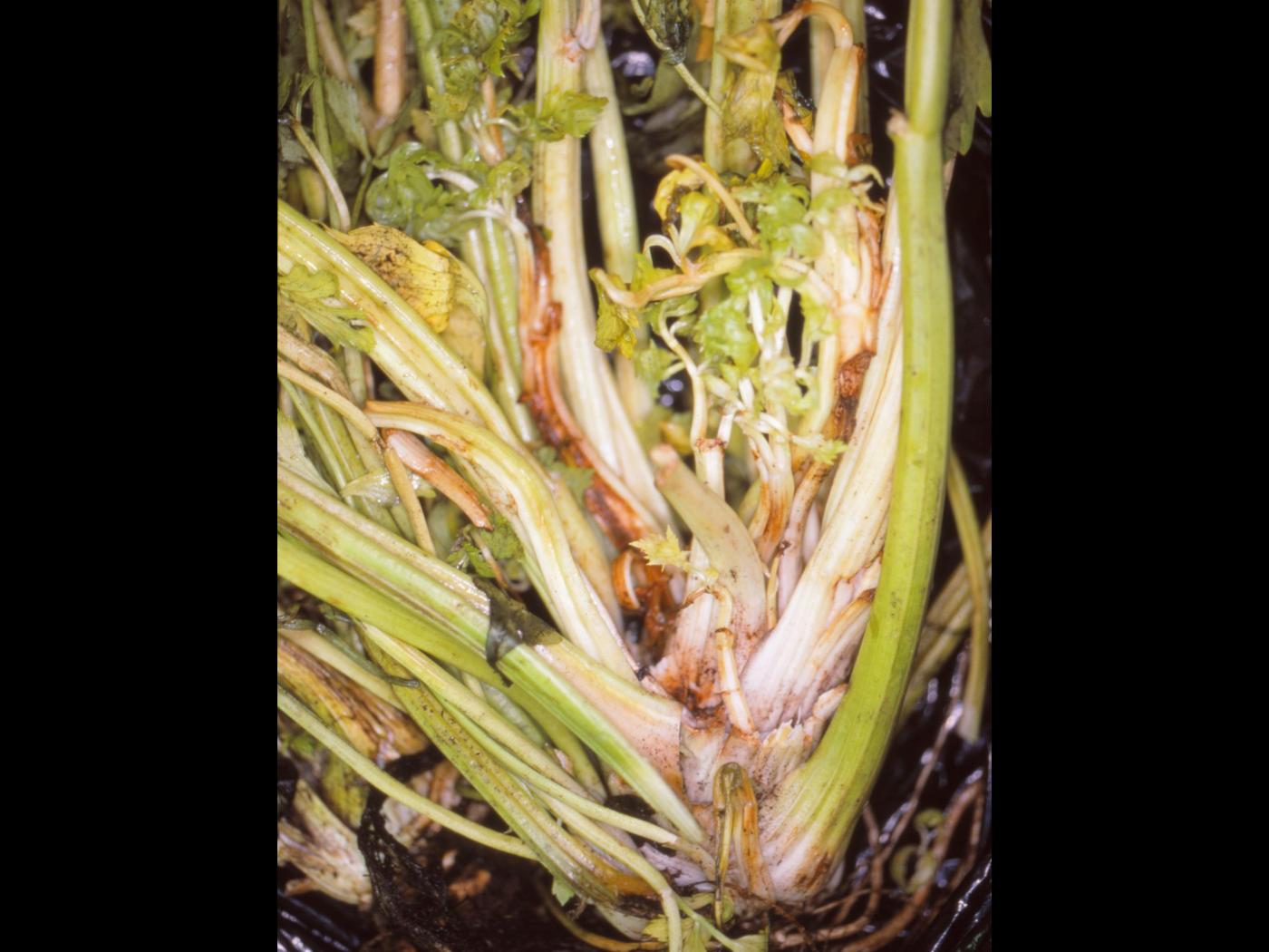Pétiole : les pétioles intérieurs sont plus petits, jaunes et déformés (enroulés, tordus, rabougris et parfois entremêlés). Les plants infectés produisent plus de pétioles que les plants sains. Les pétioles extérieurs sont plus rigides et cassants et l’épiderme peut craqueler et peler. À un stade avancé de la maladie, le cœur devient brun.