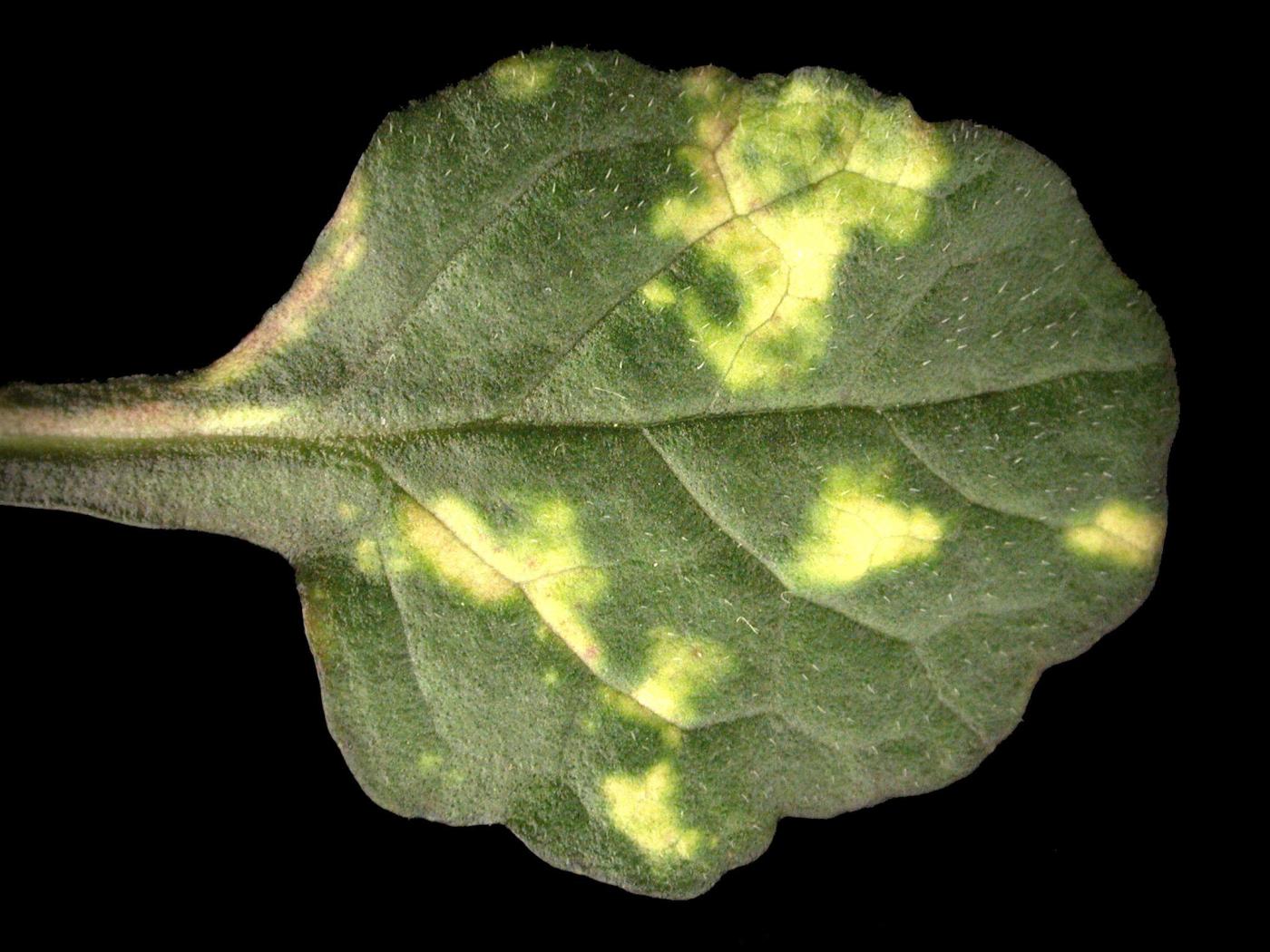 Les symptômes sur les feuilles varient selon la plante, la virulence de la souche du virus, le stade de développement de la plante et les conditions environnementales. Nous présentons les symptômes les plus fréquemment observés.