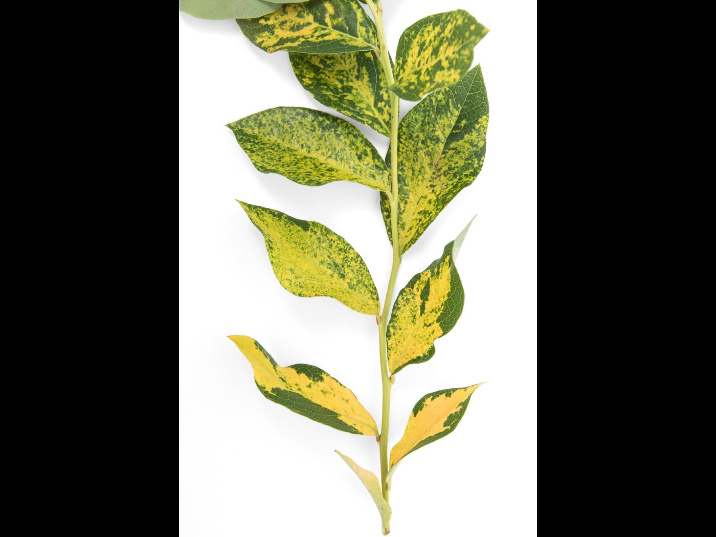 Feuilles : Marbrures et mosaïques de couleur jaune et vert pâle, pouvant prendre occasionnellement un aspect rosé.