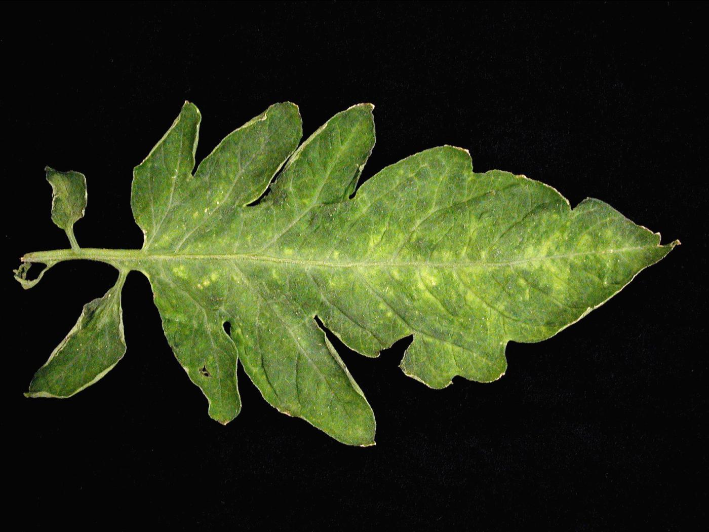 Description: Une foliole de tomate de serre (cv 'Trust') montre de petites taches jaune pâle isolées ou groupées sur un côté de la foliole et un faible jaunissement longeant la marge de la foliole. Les tests de laboratoire ont révélé la présence du virus de la mosaïque du pépino (PepMV).