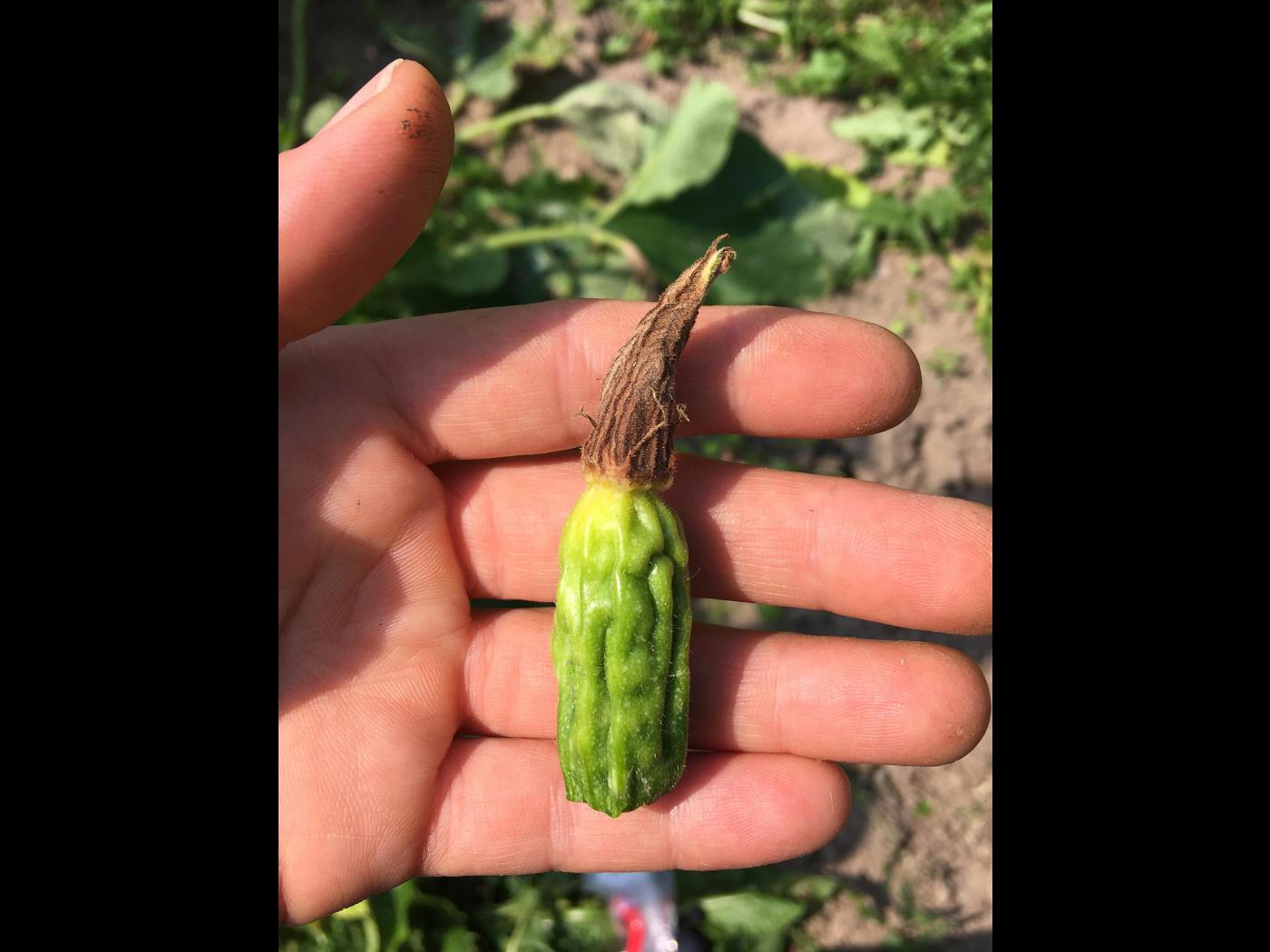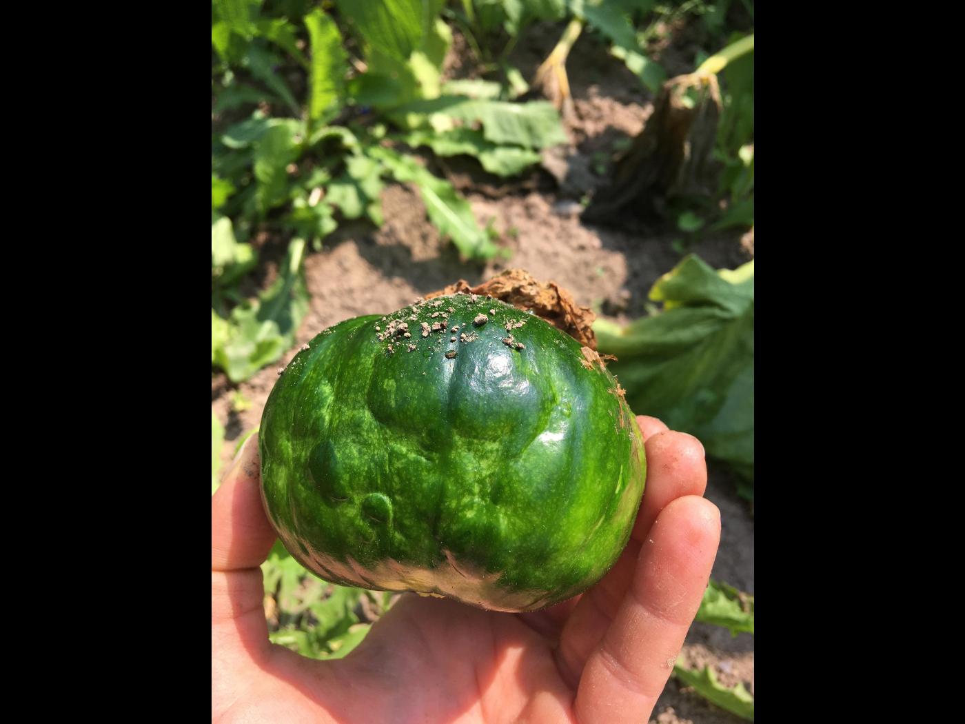 Fruit : le symptôme le plus commun du PRSV-W est la formation de taches en forme d’anneaux incrustés dans l’épiderme. Présence également d’anomalies de coloration, de mosaïques, de mouchetures et de malformations (prolifération de pustules).