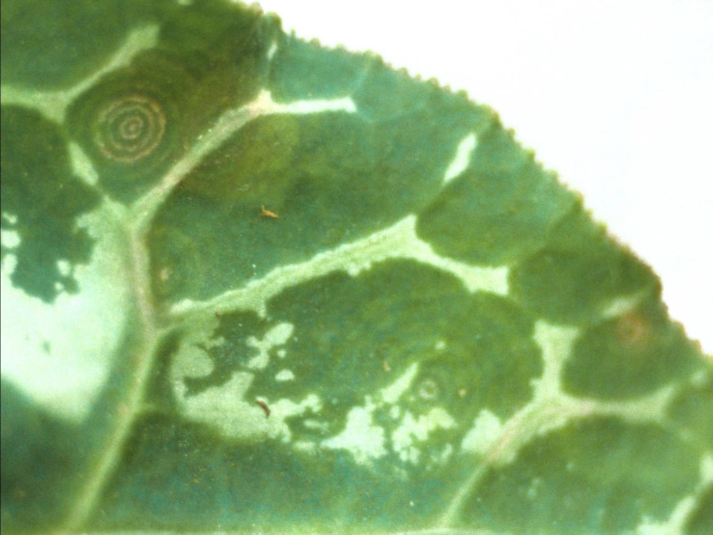 Description: Sur une feuille de cyclamen de Perse, présence de taches en anneaux concentriques bruns (voir flèches). La nature des symptômes et la présence de thrips sur les feuilles ont permis de déterminer que le virus de la tache nécrotique de l'impatiente (INSV) était responsable des dommages observés sur ce plant.