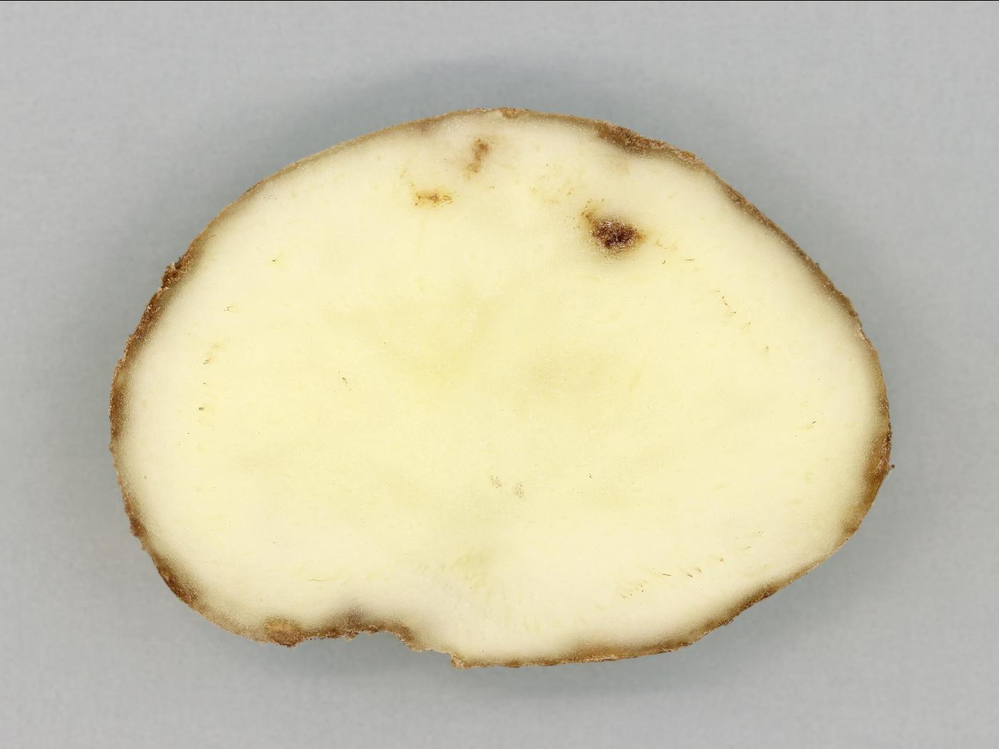 Tubercule : dans la chair, présence de nécroses annulaires composées de lignes, d’arcs ou d’anneaux nécrotiques brun rougeâtre, presque continus (appelé "spraing"). Sur les cultivars très sensibles, le périderme montre la présence d’anneaux concentriques superficiels, mais en relief, ou de lignes brun rougeâtre. Présence parfois de déformations (crevasses, peau réticulée).
