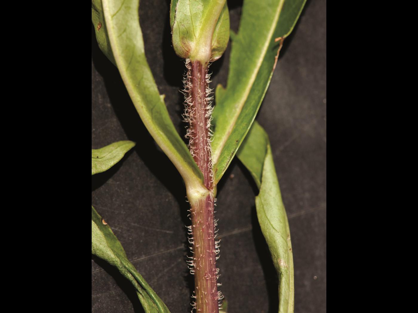 Les feuilles sont opposées, pouvant être soudées par la base autour des nœuds de la tige. Le limbe est de forme lancéolée à linéaire, il mesure de 4 à 10 cm de longueur et de 0,5 à 2,5 cm de largeur. La marge est de plus en plus dentée vers le haut de la plante. La nervure centrale est proéminente.