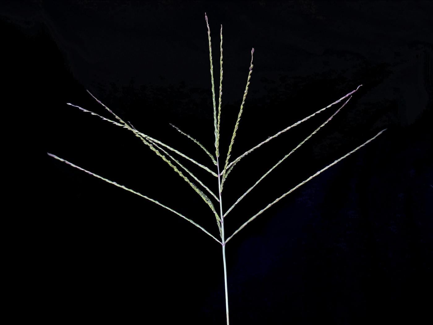 L’inflorescence est une panicule composée de 3 à 13 branches spiciformes qui mesurent de 5 à 15 cm de longueur. Les branches sont étalées comme les doigts d’une main (digitée) et attachées à un axe central, qui peut mesurer jusqu’à 6 cm de longueur. Les épillets mesurent de 2,5 à 3,4 mm de longueur et de 0,7 à 1,1 mm de largeur. Ils sont de forme elliptique lancéolée et terminés en pointe. Les épillets sont solitaires ou en groupe de 2 ou 3. Chaque épillet comporte 2 fleurons, un fertile et un stérile. La glume inférieure mesure de 0,2 à 0,4 mm de longueur et n’est pas nervurée. La glume supérieure est foliacée, pubescente sur la marge et mesure entre 0,9 et 2 mm de longueur.