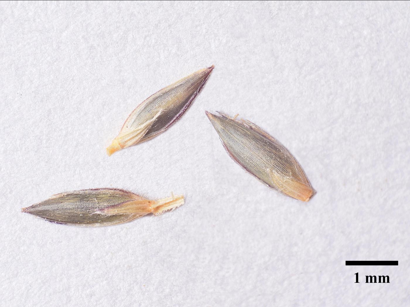 Le fruit est un caryopse enveloppé par les pièces florales coriaces. Il est de forme lancéolée allongée à lancéolée ovée, de couleur paille à vert-pourpre et mesure environ 2,5 mm de longueur.