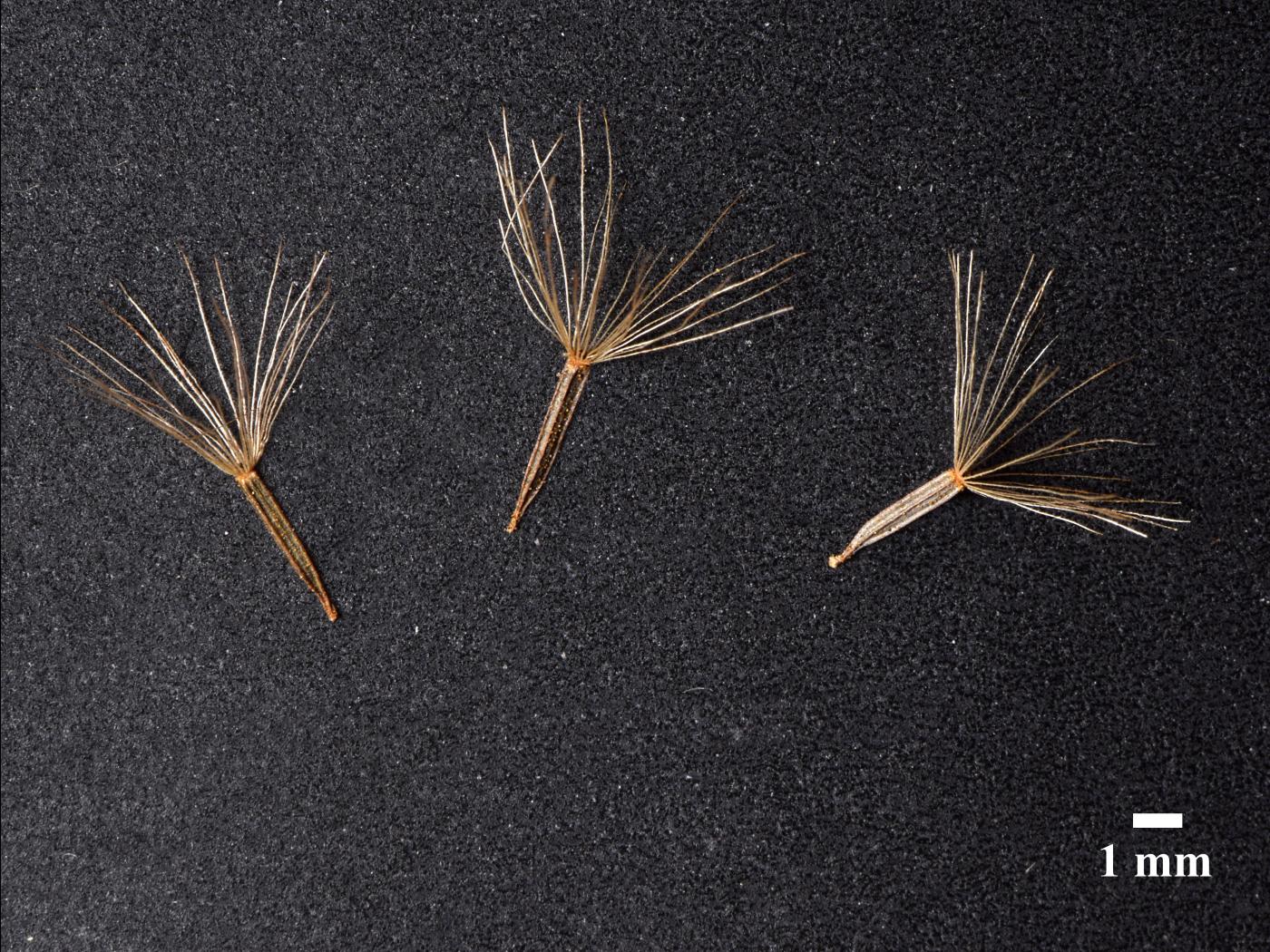Le fruit est une cypsèle qui mesure de 3 à 5 mm de longueur. Elle est de forme ellipsoïde et étroite. Elle porte à son sommet de 25 à 40 petites soies qui aident à sa dispersion par le vent.