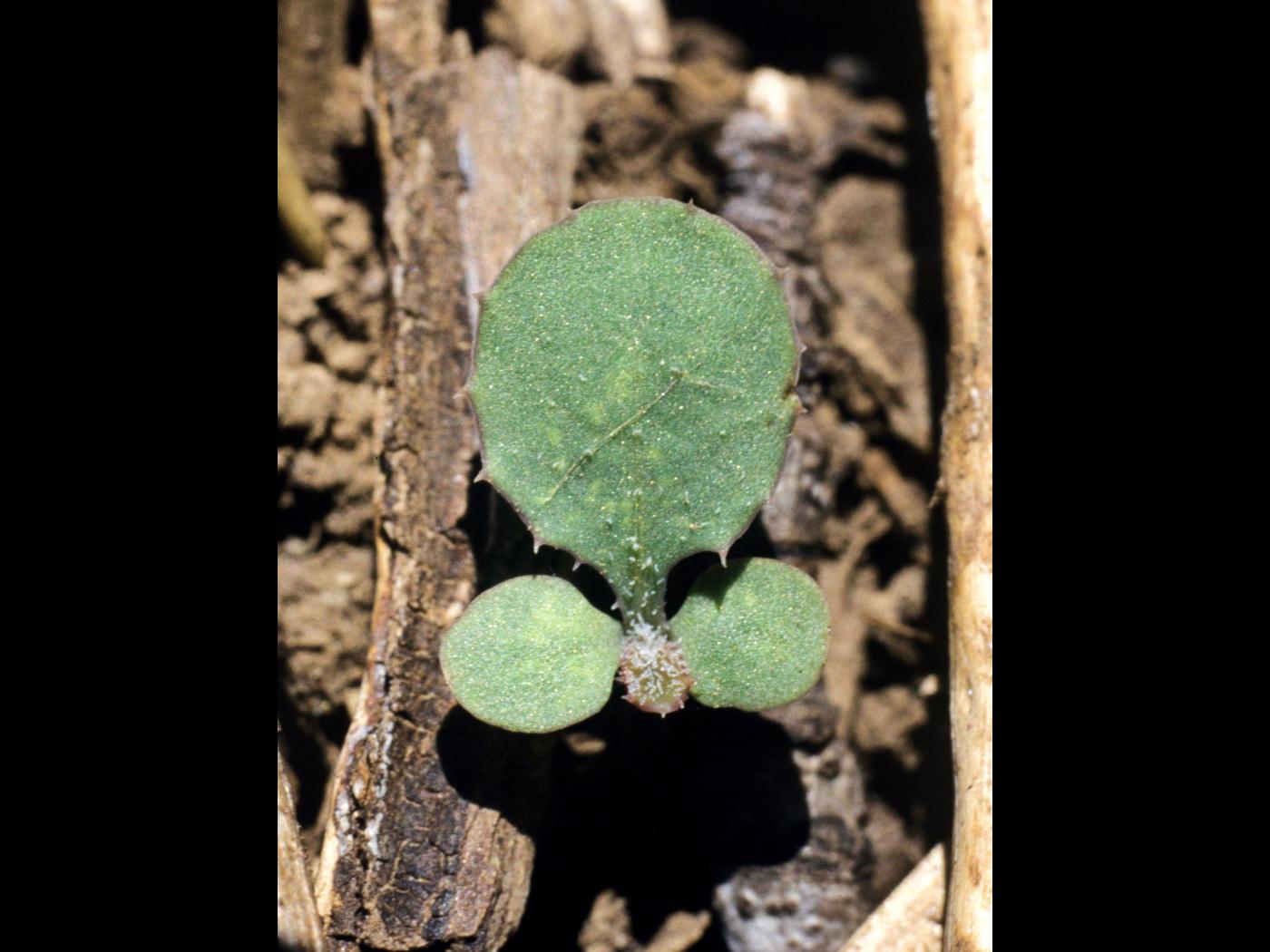 La plantule est constituée de feuilles alternes qui forment une rosette. Les cotylédons sont de forme orbiculaire à oblongue, ont un sommet arrondi à tronqué et possèdent un pétiole court. Le limbe mesure de 3 à 6 mm de longueur et la face inférieure est souvent teintée de rouge violet. Les premières feuilles sont de forme arrondie ovale à allongée avec une marge sinuée dentée.