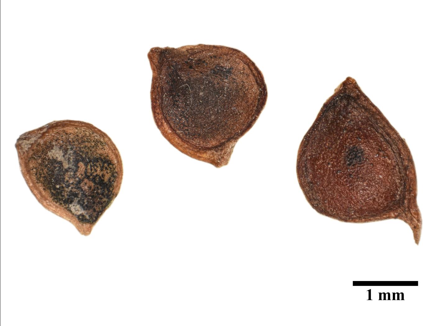Les fruits sont des akènes disposés en petite masse globuleuse de 1,2 à 1,4 cm de diamètre. L’akène mesure de 2 à 3 mm de longueur et de 1,8 à 2,4 mm de largeur. Il est aplati, de forme ovoïde et prolongé d’un bec en forme de crochet qui mesure de 0,2 à 0,4 mm de longueur. La surface est glabre, brun foncé, mate et lisse.