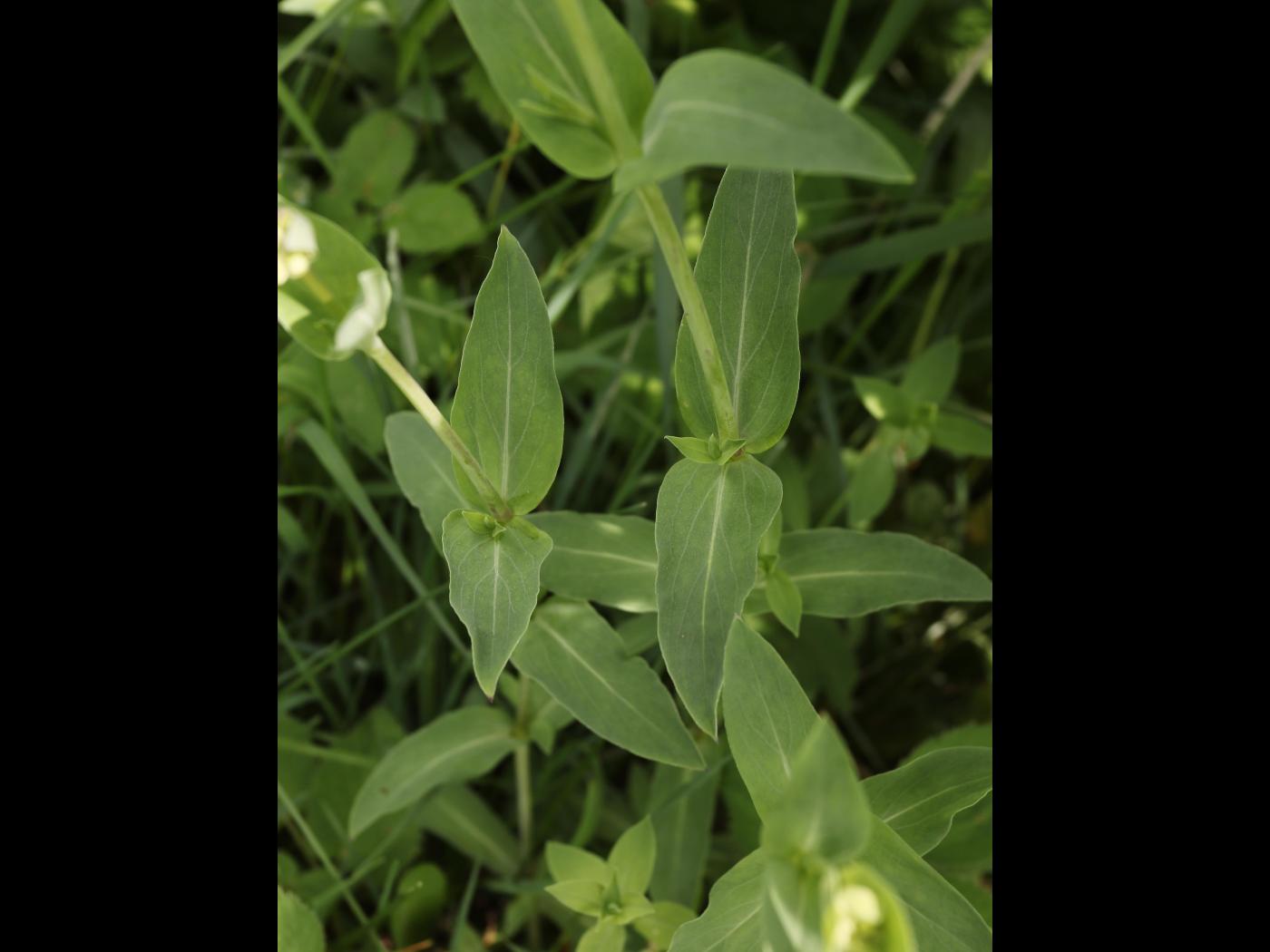 Les feuilles de la base forment une rosette. Elles sont glabres ou avec quelques poils raides présents au bord du limbe. Les feuilles caulinaires sont entièrement glabres, sessiles et opposées. Leur base entoure légèrement la tige. Les feuilles sont toutes de forme ovale à allongée avec une marge entière, une base arrondie et sont terminées par une petite pointe. Elles mesurent de 3 à 8 cm de longueur et de 0,5 à 3 cm de largeur.