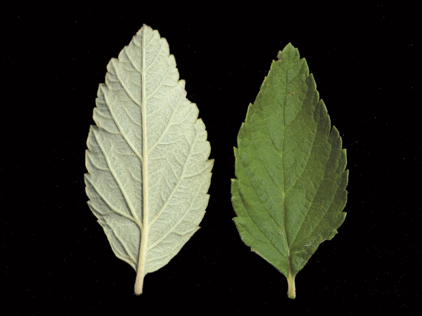 Les feuilles sont alternes et portées par un pétiole mesurant moins de 3 mm de longueur. Elles sont de forme elliptique, rétrécissant graduellement à la base et à marge dentée. La face inférieure est vert pâle et tomenteuse tandis que la face supérieure est vert foncé et glabre. Elles présentent des nervures pennées proéminentes.