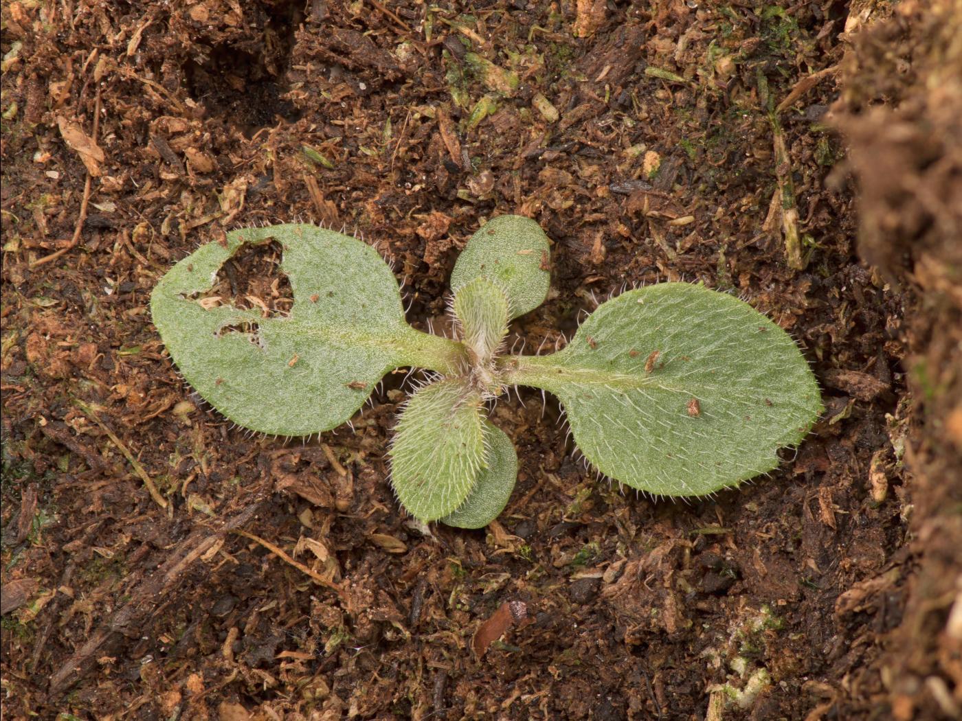 La plantule est à feuilles alternes et forme une rosette. Les cotylédons sont de forme oblongue, très petits et mesurent de 2 à 3 mm de longueur. Ils ont un sommet arrondi et un pétiole court. Les premières feuilles sont entières, de forme arrondie à ovale, très pubescentes avec des poils dressés et blanchâtres.