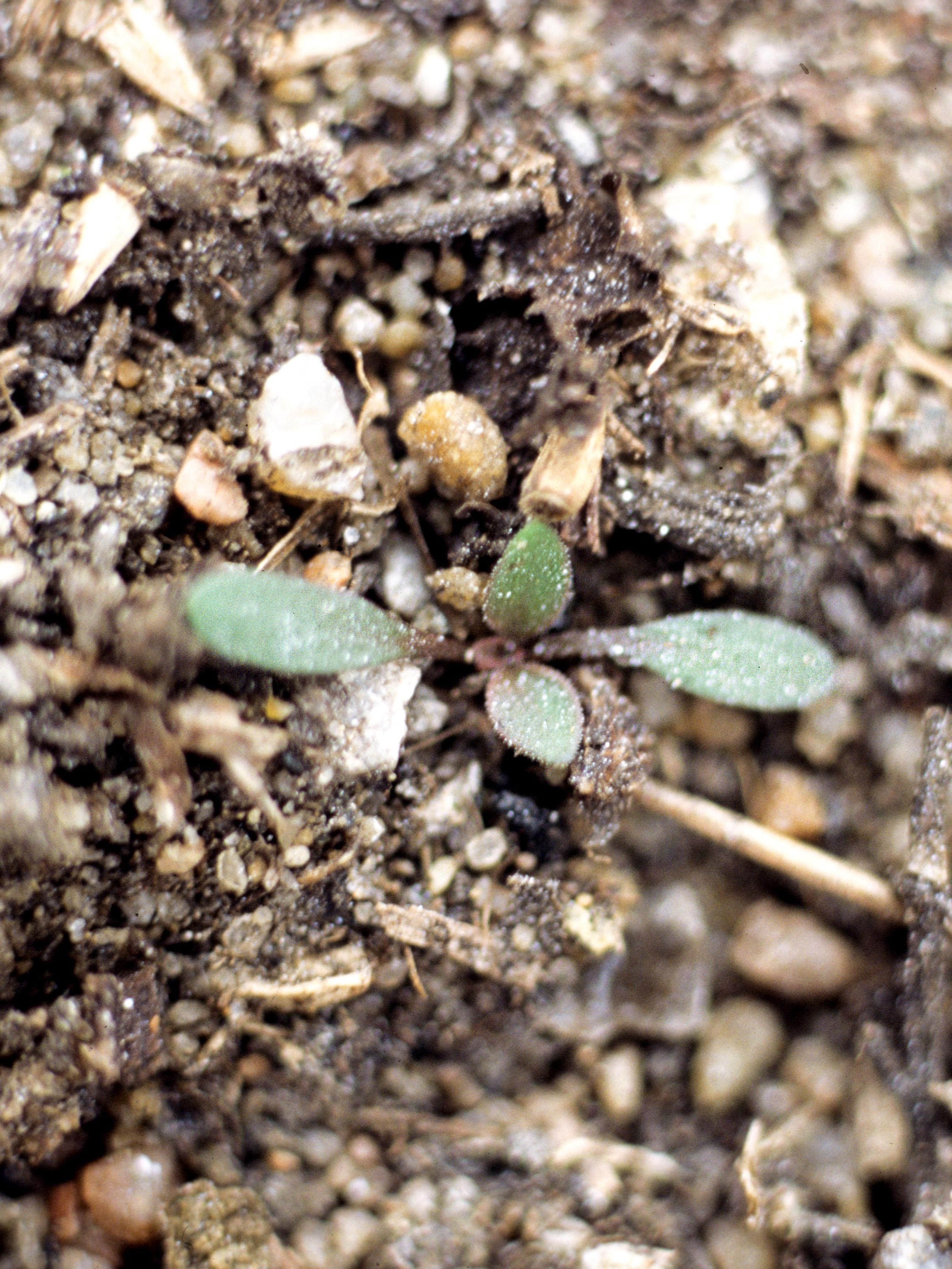 Plantule, cotylédons vert foncé, allongés avec le sommet arrondi