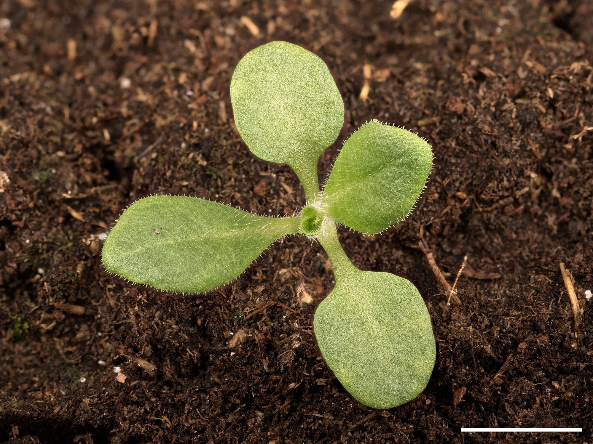 Premières feuilles arrondies à ovales, le trait horizontal = 1 cm