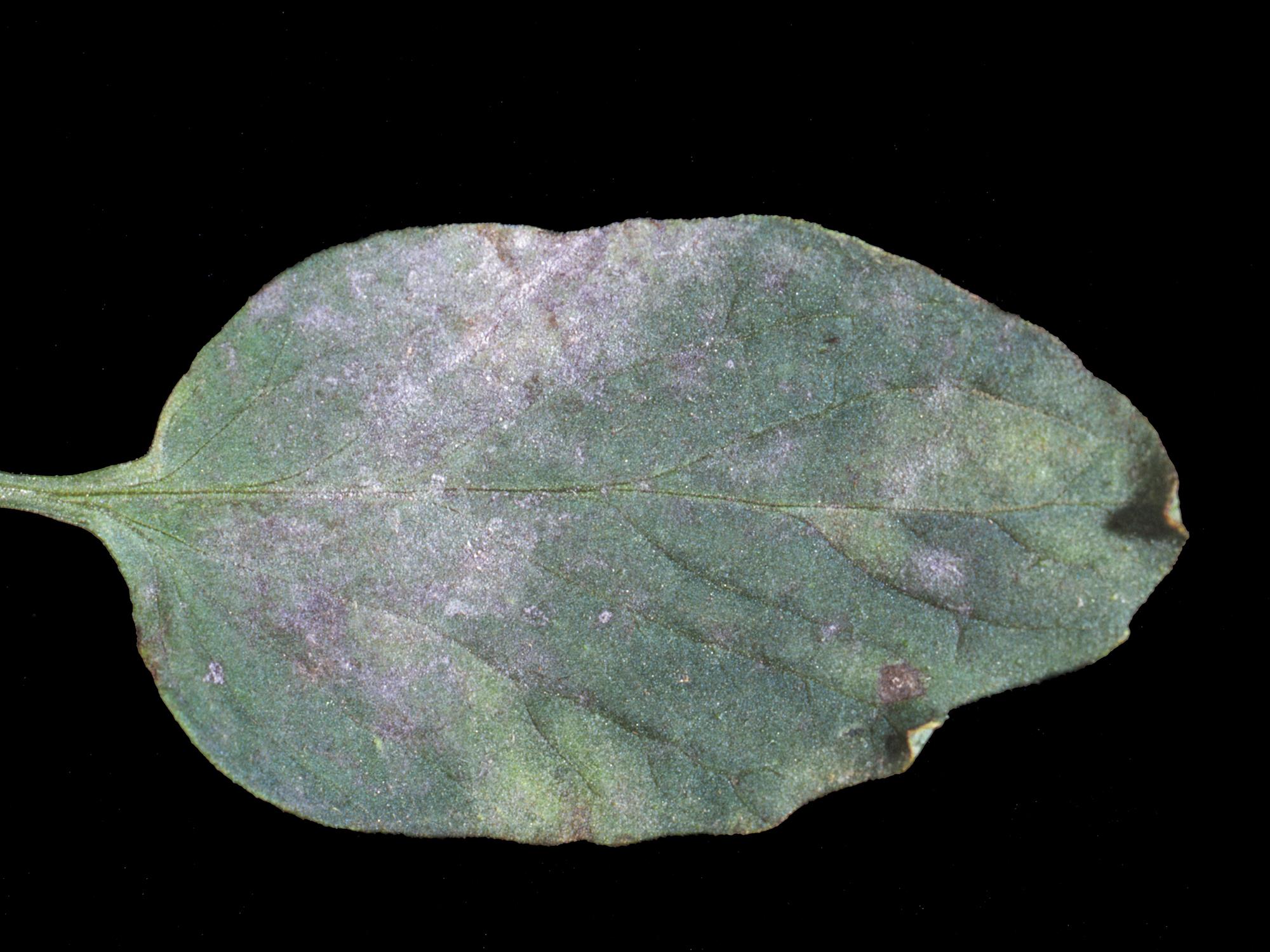 À la face supérieure d'une foliole de tomate de serre, présence de taches circulaires couvertes d’un duvet blanchâtre et de taches vert pâle à jaune pâle. Parfois les taches blanches s’unissent pour forme de larges plages blanches teintées de rose. Les observations microscopiques ont révélé la présence de spores du champignon Oidium neolycopersici, responsable du blanc chez la tomate.