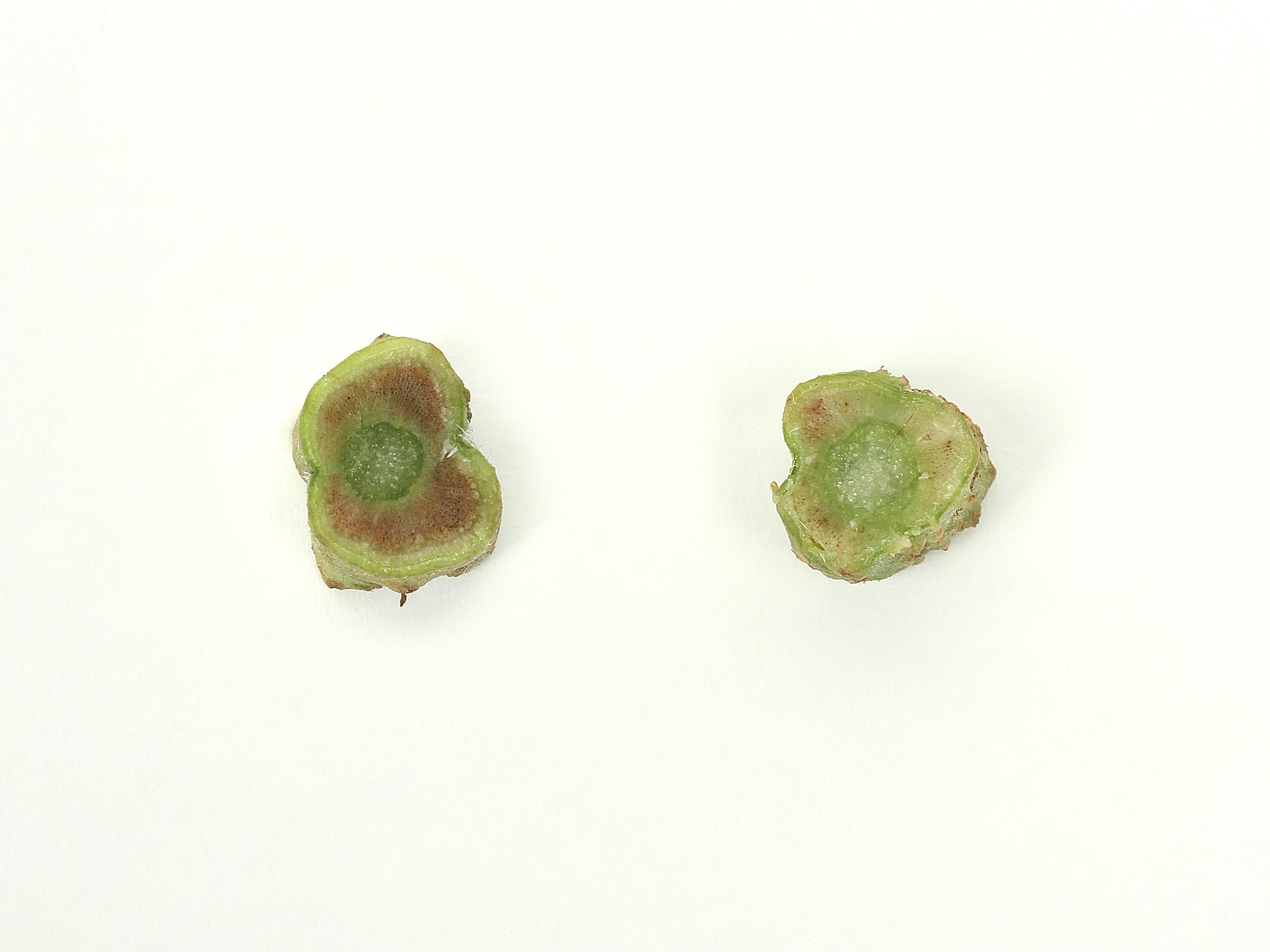 Un plant de tomate de serre (cv 'Beef') montrait un chancre au niveau du collet et à la base de la tige. Sous le chancre, le système vasculaire est brun rougeâtre. Cette anomalie de coloration progresse dans la tige, sur une distance d’environ 50 cm, mais tend à s'atténuer vers le haut du plant. Quelques feuilles montrent un jaunissement internervaire tandis que d’autres ont des zones foncées dont les tissus sont affaissés (non visible ici). Les tests de laboratoire ont révélé la présence abondante du champignon Fusarium sp. Considérant la coloration du système vasculaire et une moelle saine, il s’agit fort probablement de Fusarium oxysporum f. sp. lycopersici (FOL), responsable de la fusariose vasculaire chez la tomate. Il n'a malheureusement pas été possible d’isoler le Fusarium en culture pure afin de réaliser un test d'identification par séquençage (codage à barres d'ADN).
